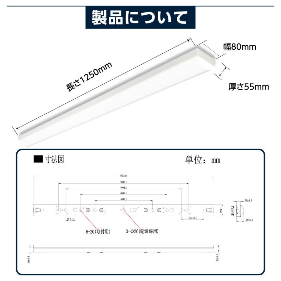 【製品仕様】ベースサイズ:(約)L1250 x W80 x H55mm、消費電力:32W、全光束:5200lm、入力電圧:AC100〜240V、使用寿命:(約)50000時間、照射角度:180°、LED数量:336個、材質:鋼板(t0.5mm)白色粉体塗装、重量:(約)2.4kg