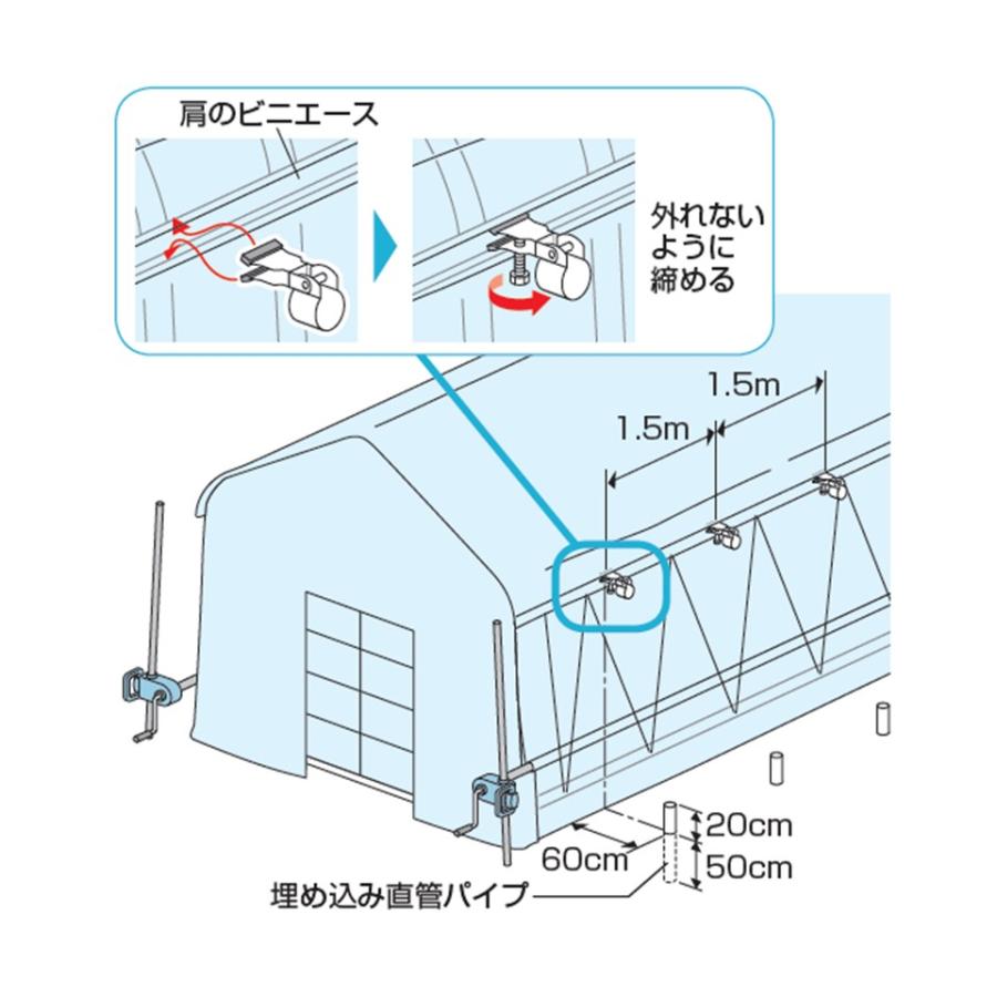 ビニールハウス肩箇所ウインドエースと22mmのパイプを外部補強金具でつなげて使用します。