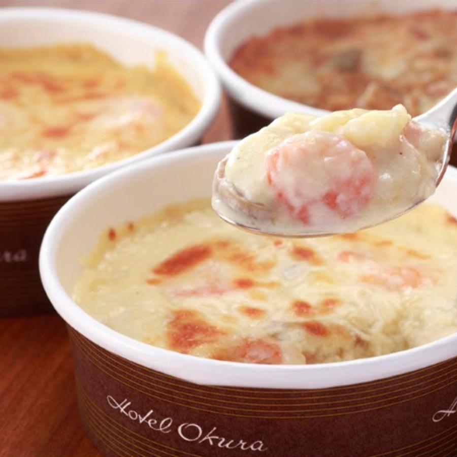 内容量:シュリンプマカロニグラタン120g×2、ポテトグラタン135g、チキンドリア135g×各2(計6個入り)
