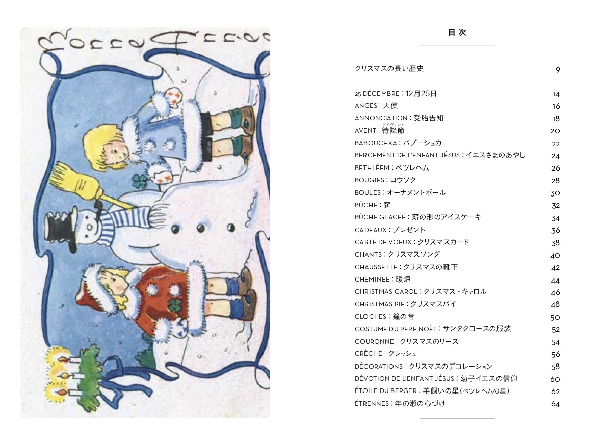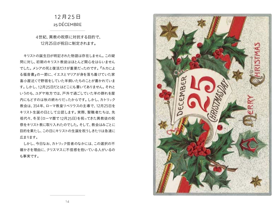 ツリーにサンタにブッシュドノエル。クリスマスに欠かせない数々だけど、いつ、誰が始めたもの?その歴史や起源には、意外な事実が潜んでいました。クリスマスに関する78のトピックを、レトロなイラストで飾るミニ事典。クリスマスの長い歴史、12月25日、天使、受胎告知、待降節、バブーシュカ、イエスさまのあやし、ベツレヘム、ロウソク、オーナメントボール、薪、薪の形のアイスケーキ、プレゼント、クリスマスカード、クリスマスソング、クリスマスの靴下、暖炉、クリスマス・キャロル、クリスマスパイ、鐘の音、サンタクロースの服装、クリスマスのリース、クレッシュ、クリスマスのデコレーション、幼子イエスの信仰、羊飼いの星(ベツレヘムの星)、年の瀬の心づけ…など78項目