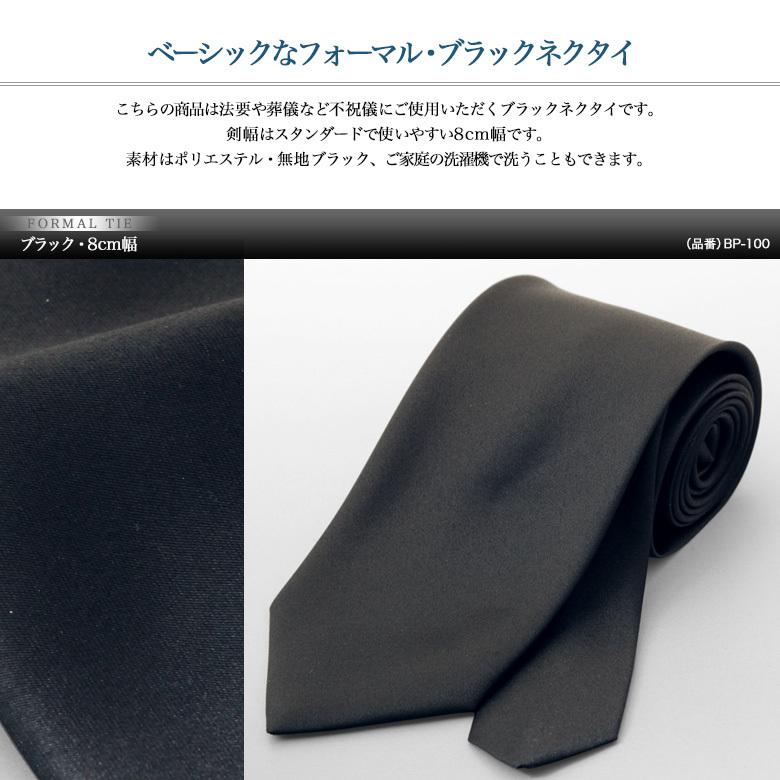 こちらの商品は法要や葬儀など不祝儀にご使用いただくブラックネクタイです。剣幅はスタンダードで使いやすい8cm幅です。素材はポリエステル100%・無地ブラックです。 ご家庭の洗濯機で洗えます。 ■クオリティー:ポリエステル100%■大剣幅:8cm幅■長さ:142cm■カラー(商品番号):ブラック(BP-100)