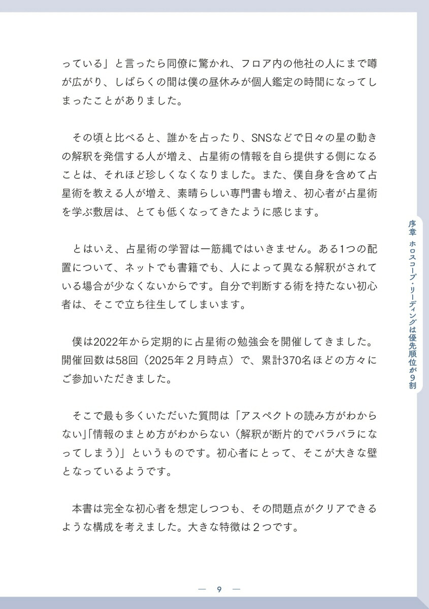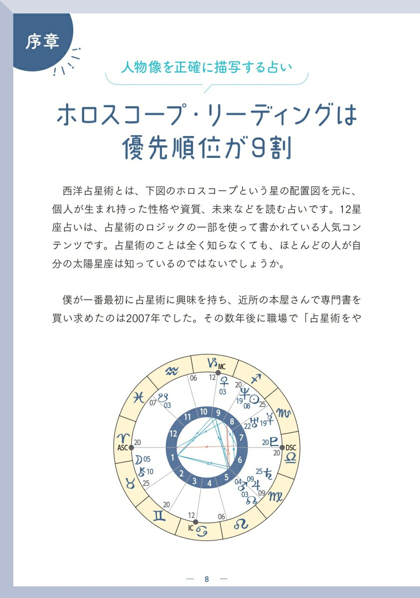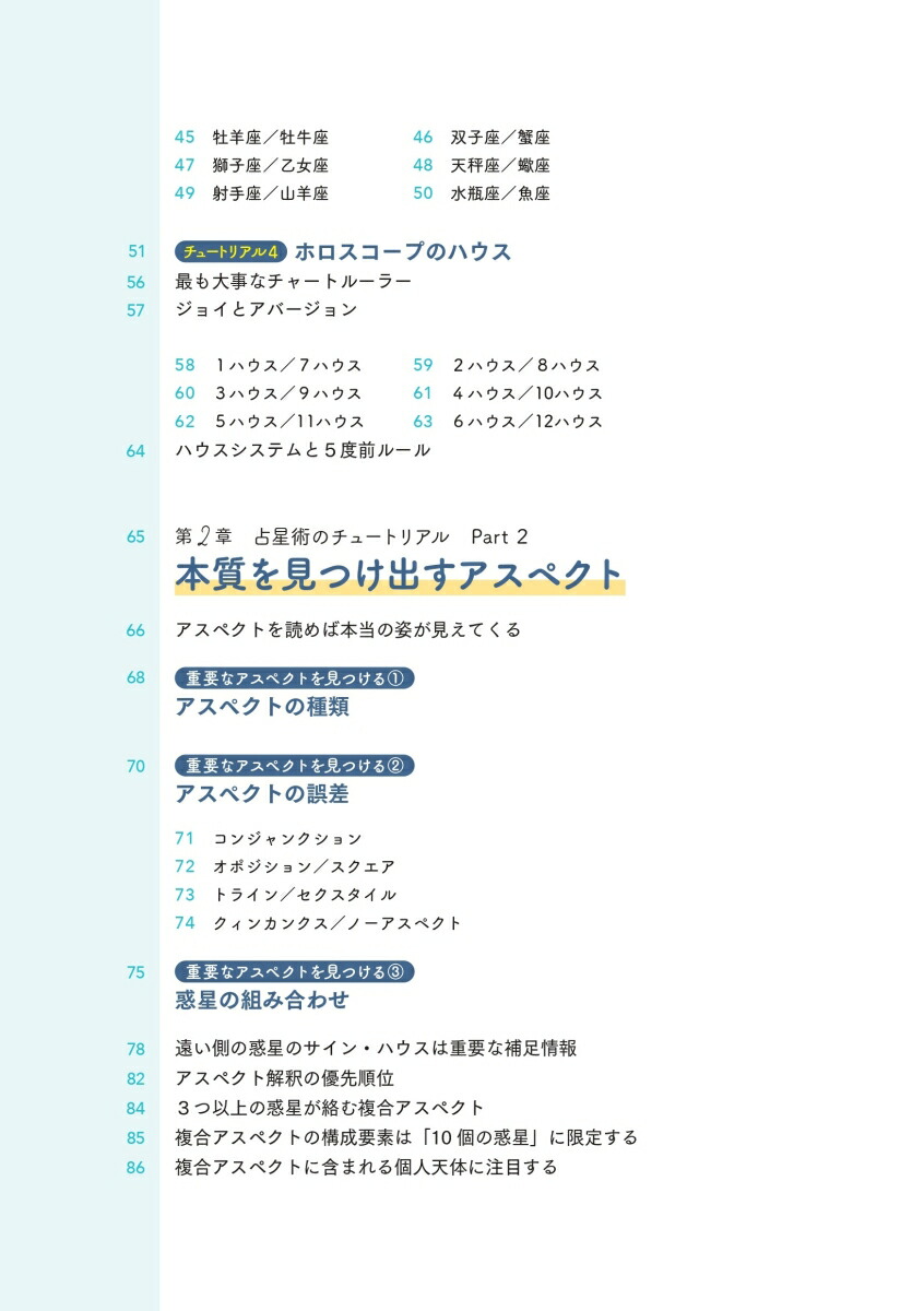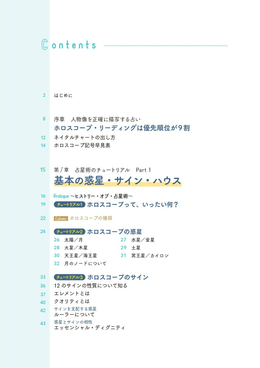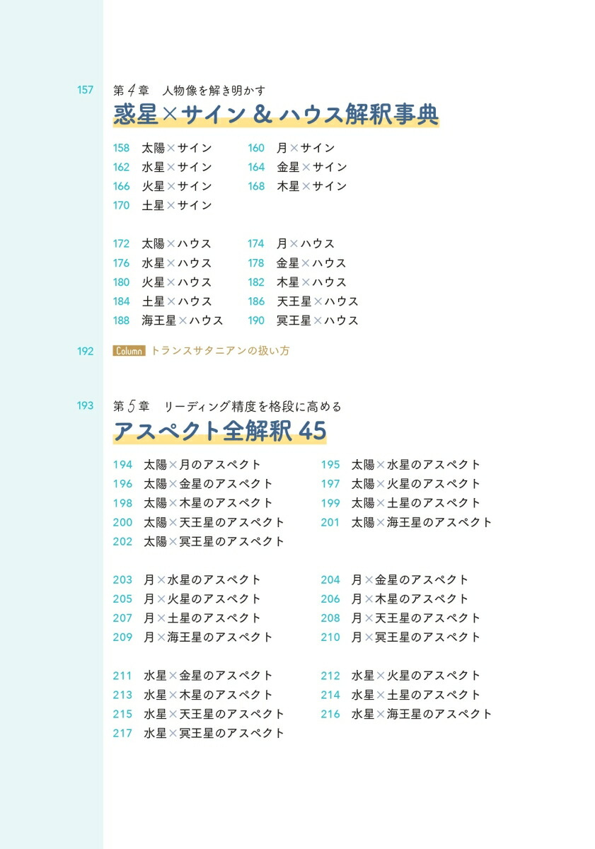 序章 人物像を正確に描写する占い ホロスコープ・リーディングは優先順位が9割/第1章 占星術のチュートリアル Part1 基本の惑星・サイン・ハウス/第2章 占星術のチュートリアル Part2 本質を見つけ出すアスペクト/第3章 ホロスコープ解読のフローチャート 基本&悩み別のリーディング手順/第4章 人物像を解き明かす 惑星×サイン&ハウス解釈事典/第5章 リーディング精度を格段に高める アスペクト全解釈45