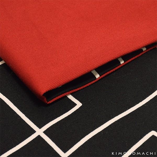 【色柄】黒地に、白に近い生成り色のラインのランダムなスクエア柄。手描き風のゆらぎのある線がシャープになりすぎない味わいを添えています。裏地は深い赤。結び方を工夫して、裏地を見せて締めればコントラストの効いたオシャレな印象に!気軽に楽しんでいただける帯です。