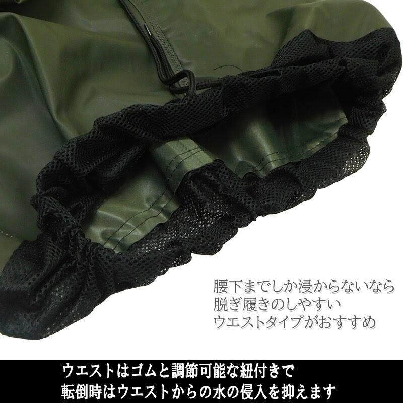商品仕様■カラー:カーキ〜薄緑のような色味■靴底素材:ラジアル■ブーツ部素材:PVC■メーカー FINE JAPAN(ファインジャパン)商品説明腰下までしか浸からないなら脱ぎ履きのしやすいウエストタイプがおすすめ。普通のウェーダーよりも着脱しやすく、ヒップウエダーよりも扱いやすいかさ張りにくく、柔らかなPVC素材を使用しているので、長靴感覚で気軽に使えてちょっとした作業等に重宝します。ウエストゴムと調節可能な紐付きでウエストにフィットソールはグリップのいい深溝のラジアル底で、船上でも使え、スパイクとは違って音も少なく、床を傷つける事もありません。徹底的に無駄を省いた省設計。