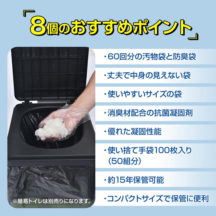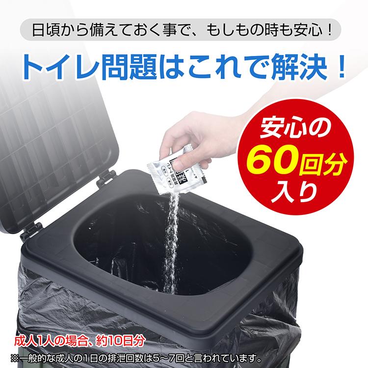 防災トイレ 簡易トイレセット 抗菌凝固剤 60回分 車 携帯トイレ ミニトイレ 消臭 汚物袋 防臭袋 使い捨て手袋 非常用 緊急用 災害時 介護用 簡易トイレ 凝固剤 凝固剤のみ 抗菌 介護 防災 非常用 非常時 車 災害 渋滞 トイレセット コンパクト 防災セット トイレ 固まる