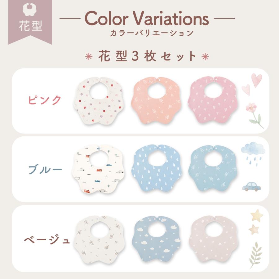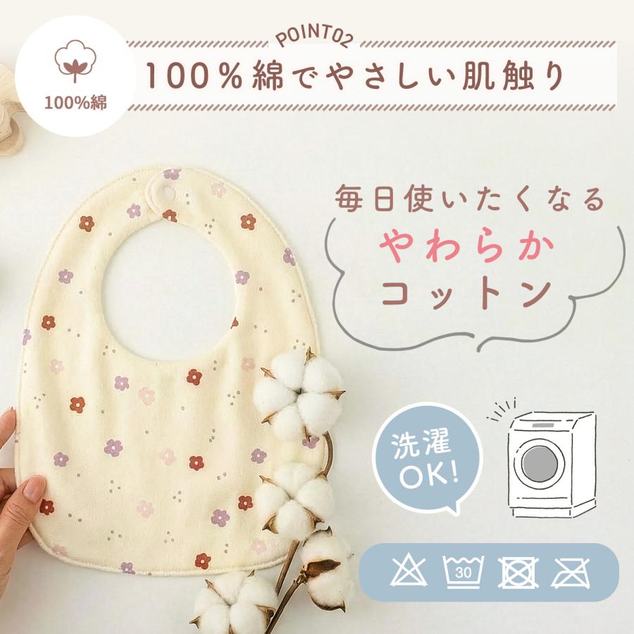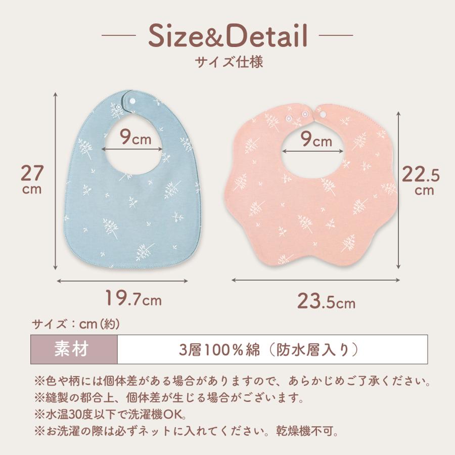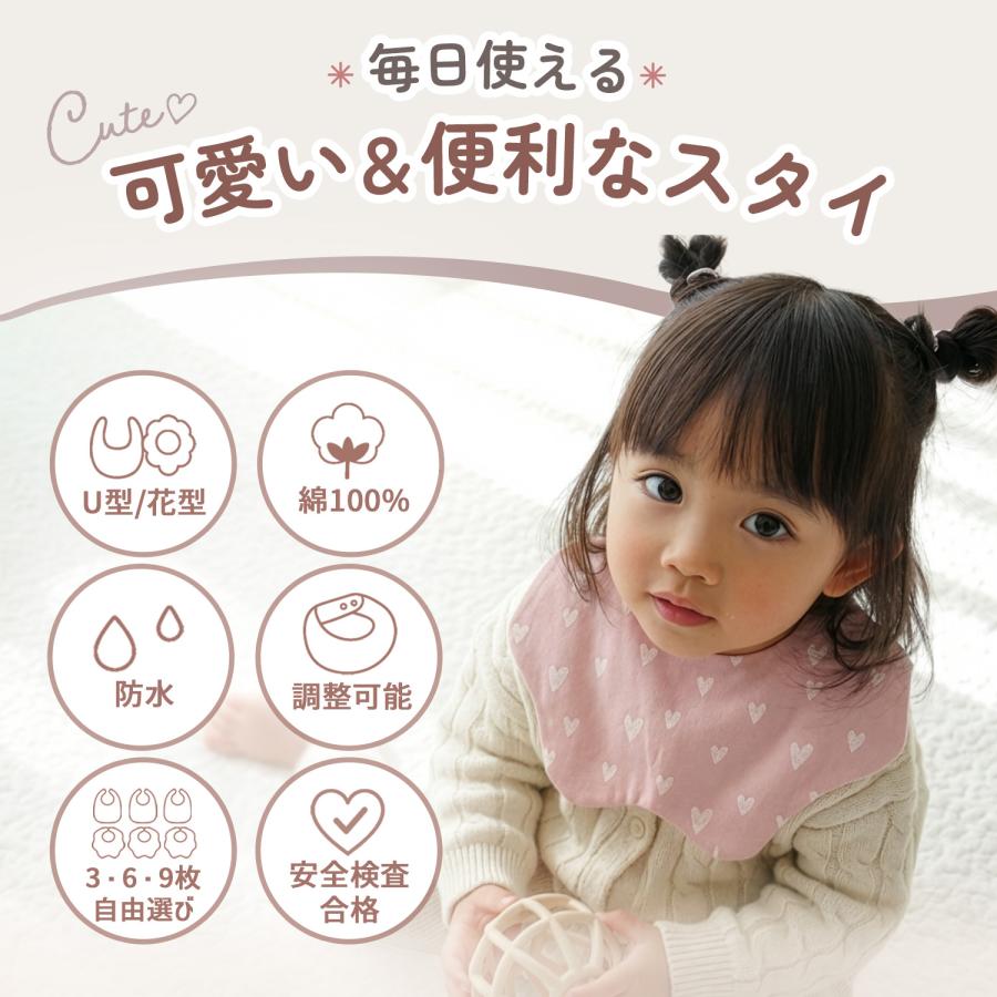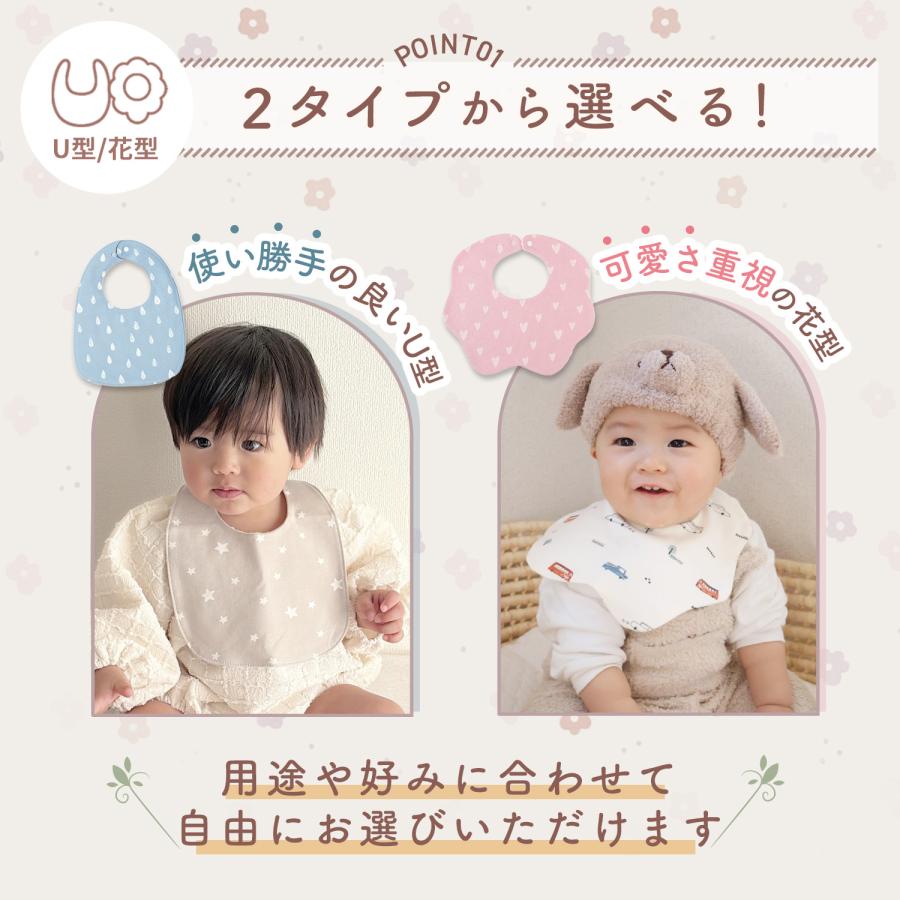 使い勝手の良い定番U型と、見た目が可愛らしい花型の2タイプをご用意。よだれ量やコーディネート、シーンに合わせて選べます。