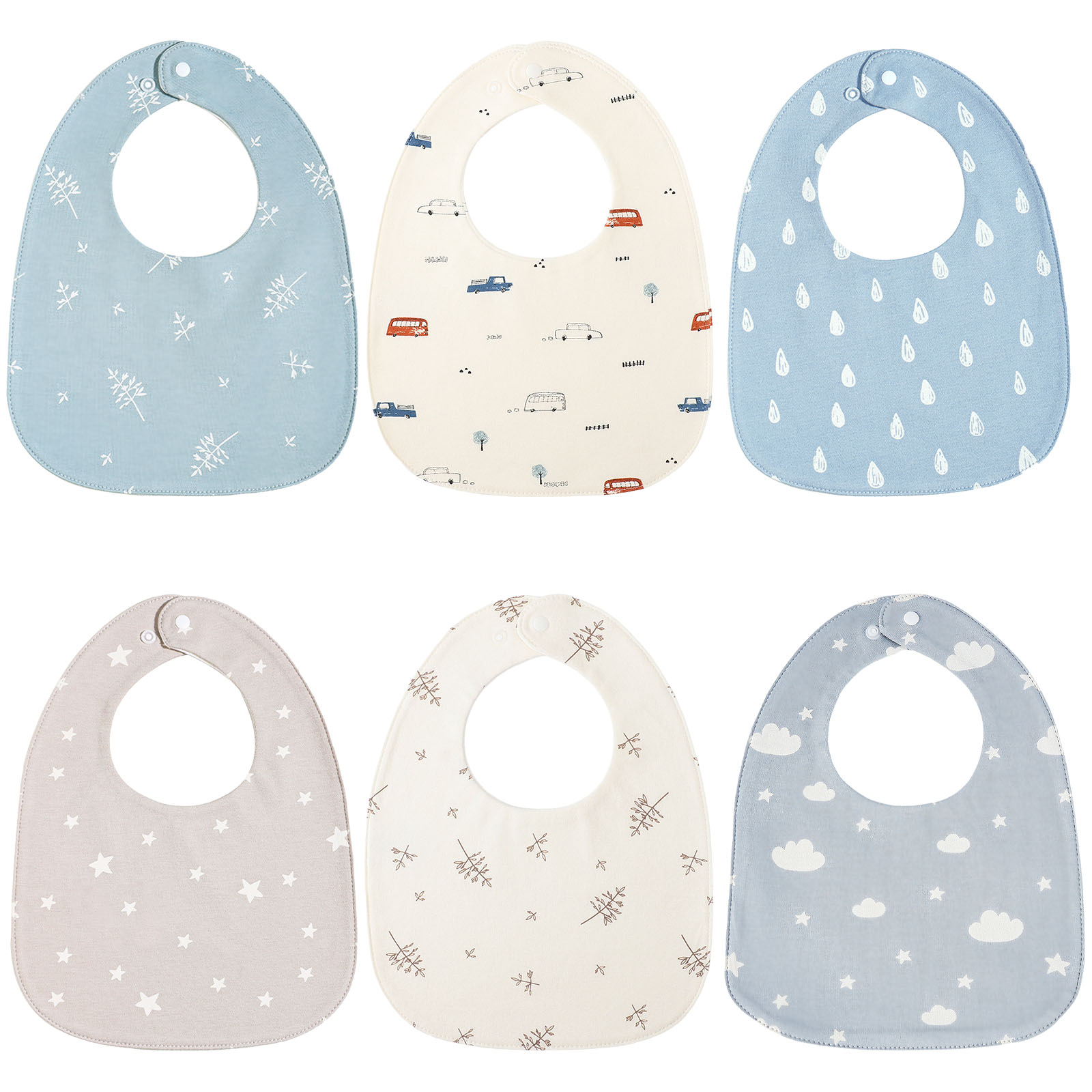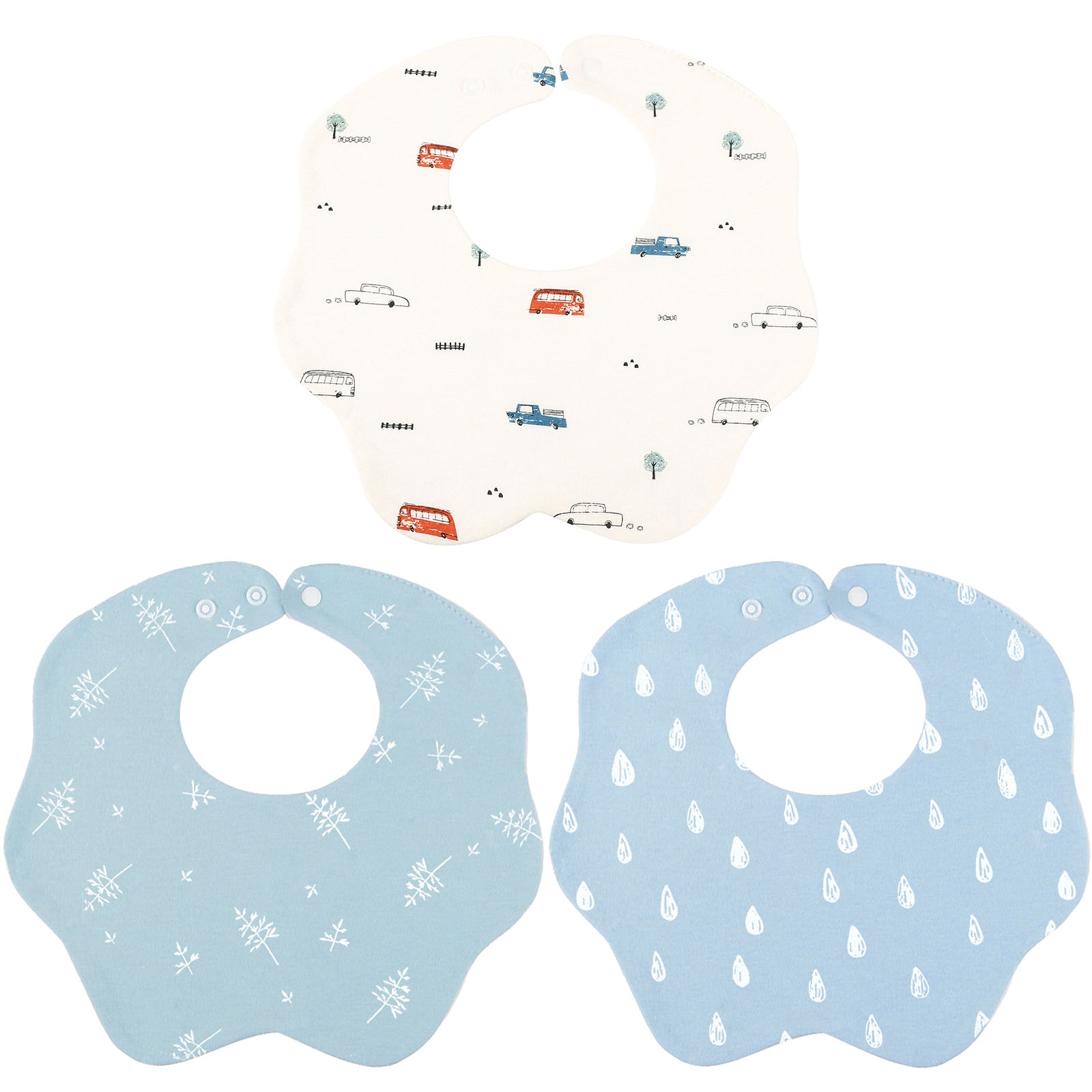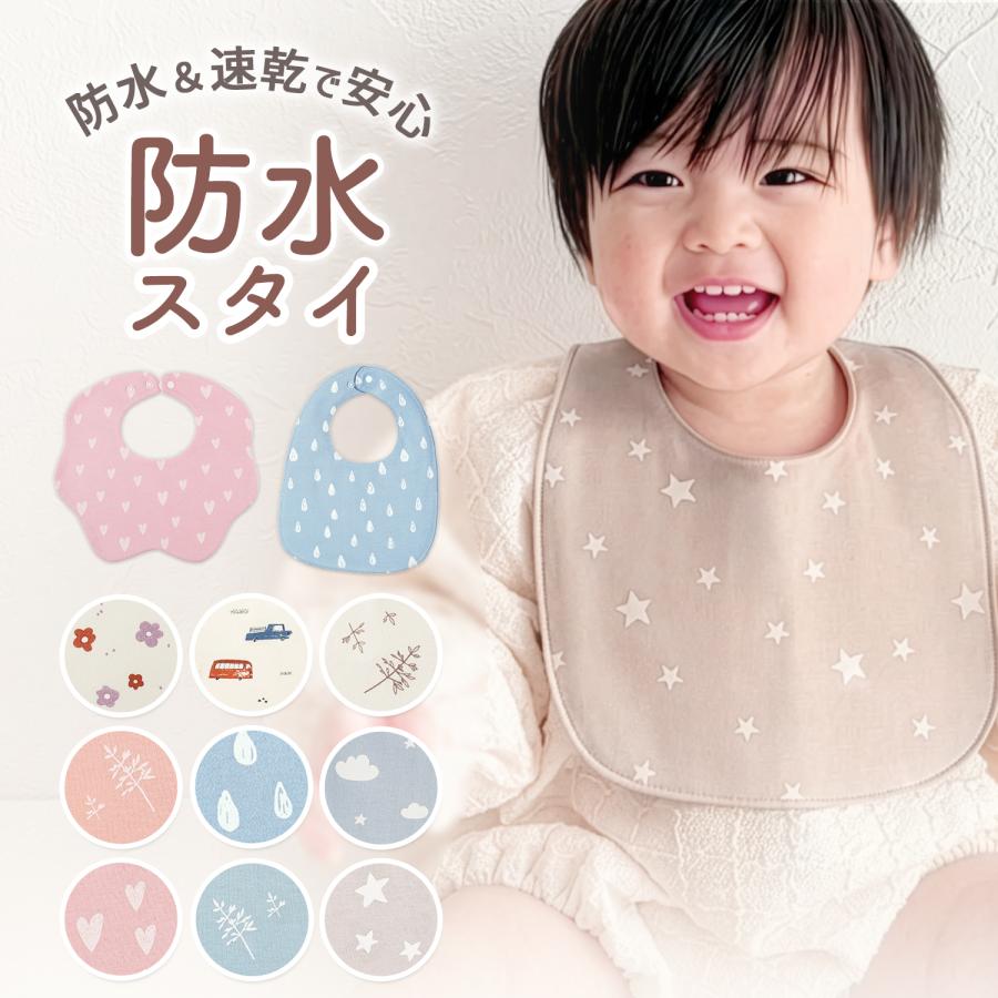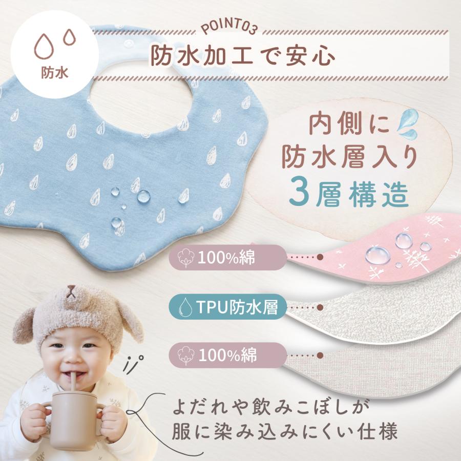 よだれや飲みこぼしが多い時期に活躍する、防水加工入りのスタイ。内側に防水層を挟んだ3層構造で、衣類への染み込みを軽減します。