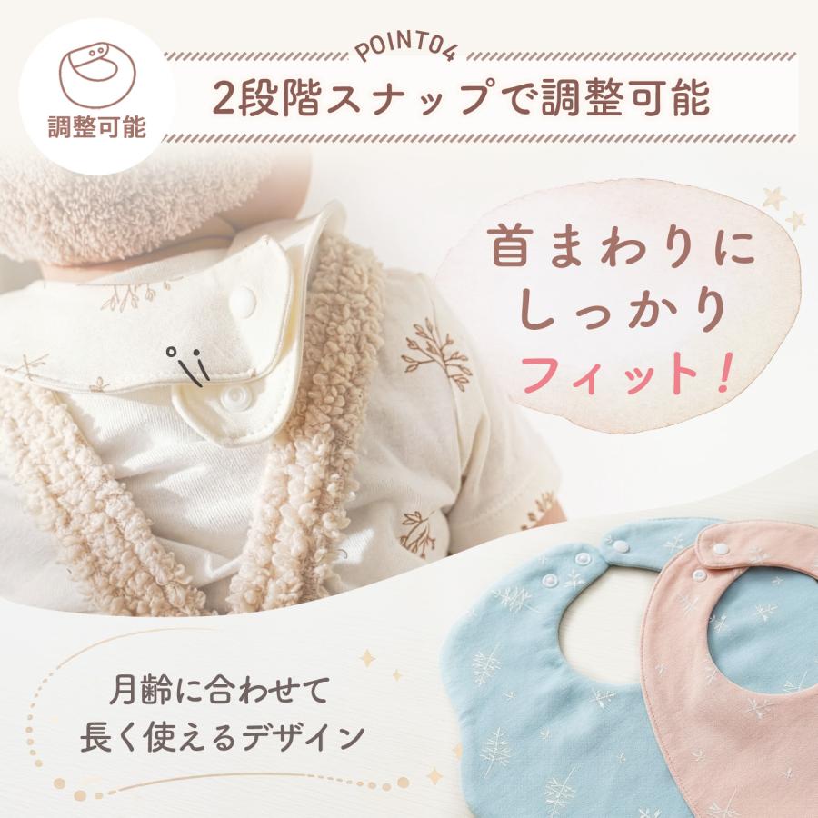 首回りは2段階スナップ仕様で、月齢や体格に合わせて微調整が可能。ズレにくくフィットしやすいため、動きが増えてきた時期にも使いやすい設計です。