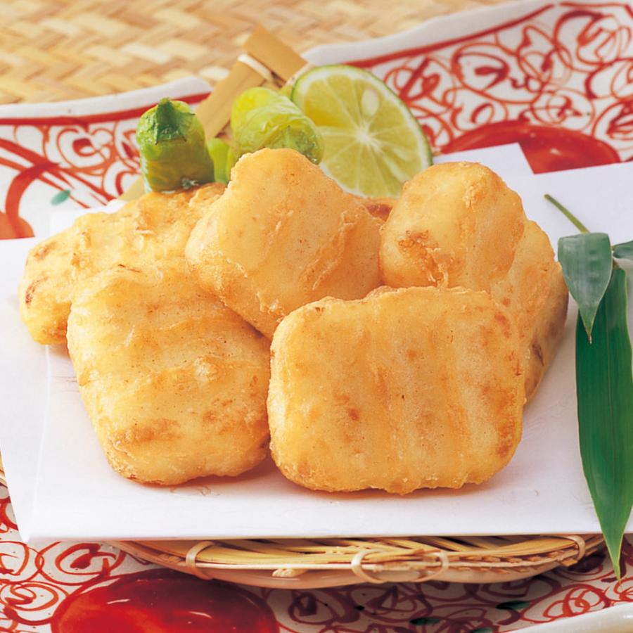 くずした豆腐に魚肉すり身・豆乳等を合わせたふんわり生地を、ひとくちサイズのナゲット風に仕上げました。乳・卵原料不使用です。