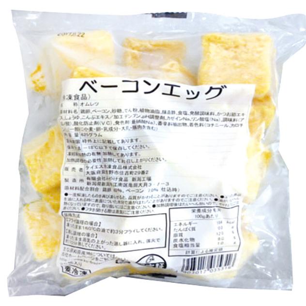 ■原材料:鶏卵(国産)、ベーコン、砂糖、でん粉、植物油脂、醸造酢、食塩、発酵調味料、かつお節エキス、しょうゆ、こんぶエキス/加工デンプン、ゲル化剤(加工デンプン、増粘多糖類)、pH調整剤、リン酸塩(Na)、調味料(アミノ酸等)、酸化防止剤(V.C)、発色剤(亜硝酸Na)、着色料(カロチン、コチニール)、(一部に小麦・卵・乳成分・大豆・豚肉を含む)