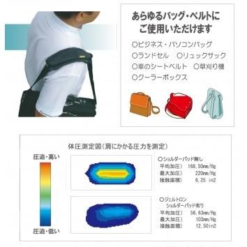 体圧分散性に優れた新素材「ジェルトロン」で、バッグから肩にかかる重さ・衝撃を軽減!スベリ止め効果もあり、肩からのズレ落ちを防ぎバッグの使用感をアップします。バッグ・ベルトにご使用可能。プロゴルフキャディにも愛用されている快適ショルダーパッドです。ジェルトロンショルダーパットを使用することにより、接地面積が2倍、平均加圧がほぼ3分の1に減少します。バッグ リュック 登山 ゴルフ レジャー 負担軽減 パッド クッション