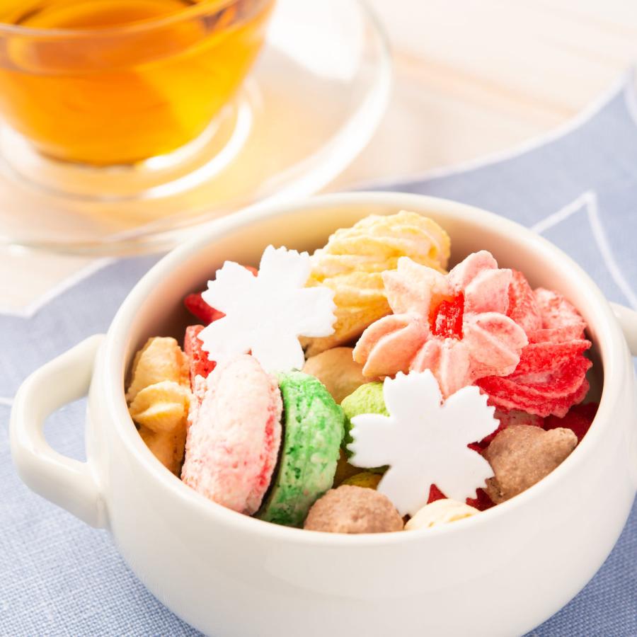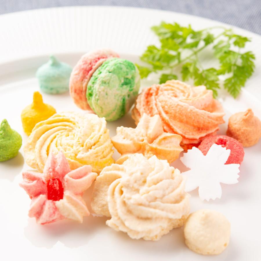 マカロンボーロミックスをお花畑のイメージで吹寄せ風に詰め合わせた、ボックス缶のセットです。マカロンボーロとは、生地に直接味付けをすることで常温保存が可能なオリジナルのマカロンです。食感はサクサクとしています。7種(ショコラ・カラメル・イチゴ・シトロン・ピスタチオ・バニラ・アーモンド)のフレーバーのマカロンボーロのほか、チョコレートでサンドしたミニマカロンや、花形のモチーフも一緒に入っています。一粒一粒の風味をお楽しみください。