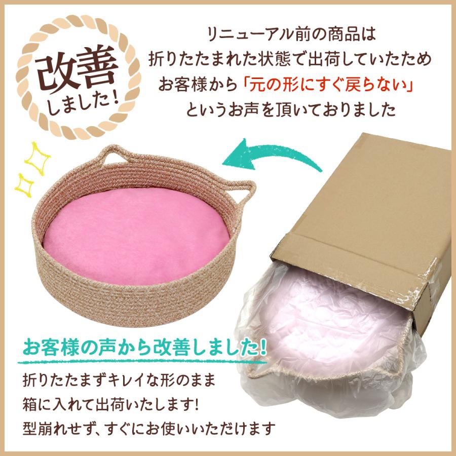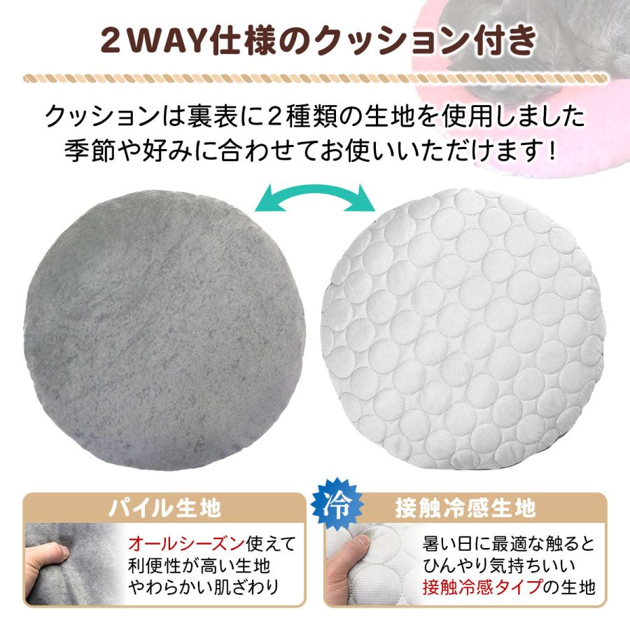 【ペットベットの材質】ベッドは1本の頑丈な綿ロープで作られています。ネコちゃんが爪を研いでしまっても壊れにくく長期間ご愛用できる設計です。クッションの中身はもこもこのPP綿が入っています。生地は接触冷感生地とパイル生地の2WAY仕様で、暑い夏はもちろんのこと季節に合わせてお使いいただけます。クッションカバーを取り外し、洗うことができるのでいつでも衛生的です。手洗いのみで洗濯機はご利用いただけません。