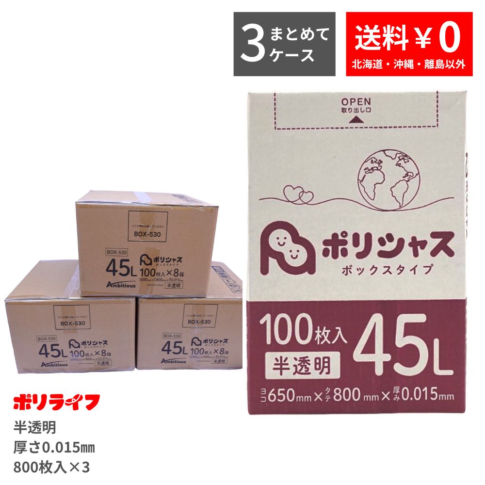 【ポイント3倍】【まとめて3ケース】ゴミ袋 45L 半透明 100枚 箱タイプ 0.015mm厚 8小箱入×3ケース(合計 2400枚) 1小箱あたり641円 1枚6.41円 送料無料 HDPE素材 ポリ袋 ビニール袋 BOX-530-3 ポリライフ ポリシャス アンビシャス