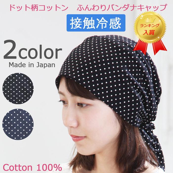 接触冷感コットンを使用した ゆるっとラクチンでおしゃれ感もキープ出来るドット柄のバンダナキャップです♪