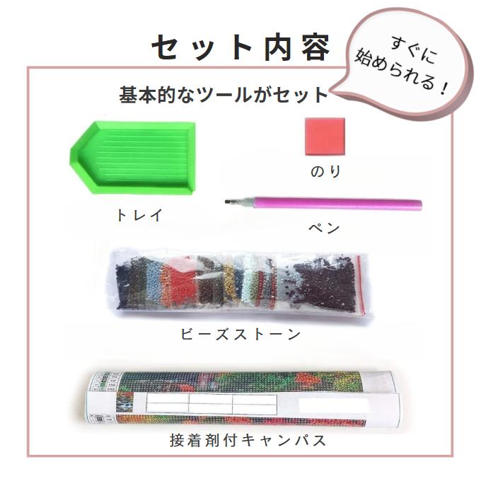 セット内容:接着剤付きベースキャンバス、ビーズストーン、トレー、ペン、ゲル状糊