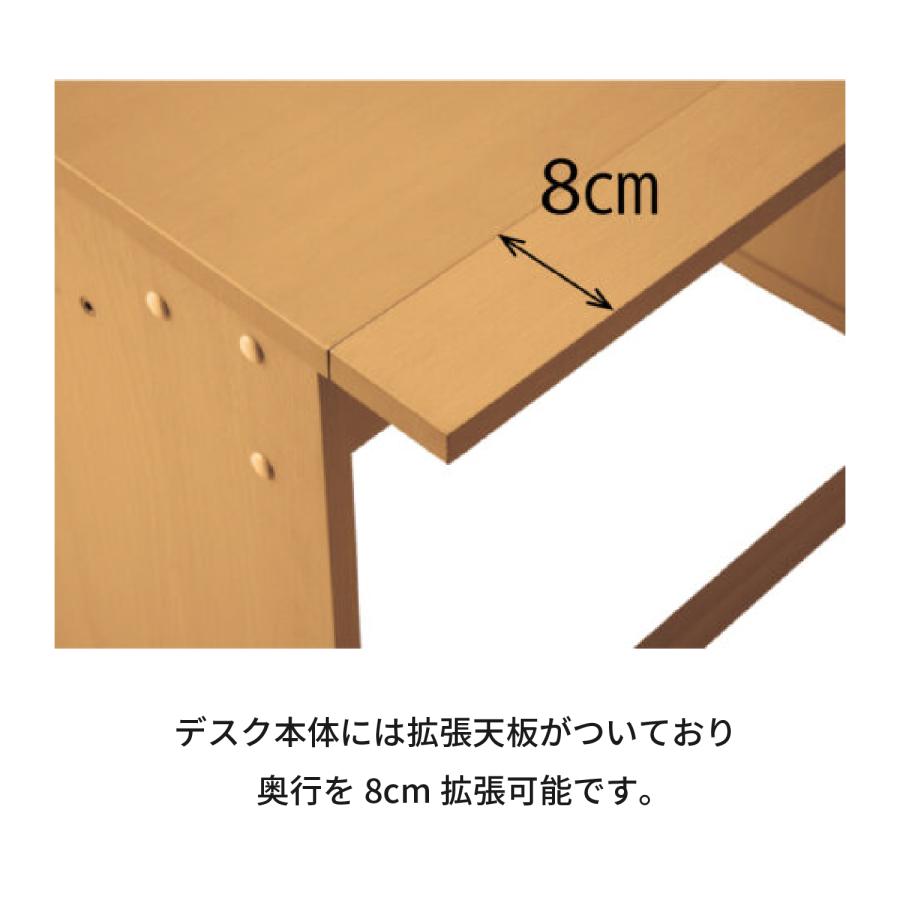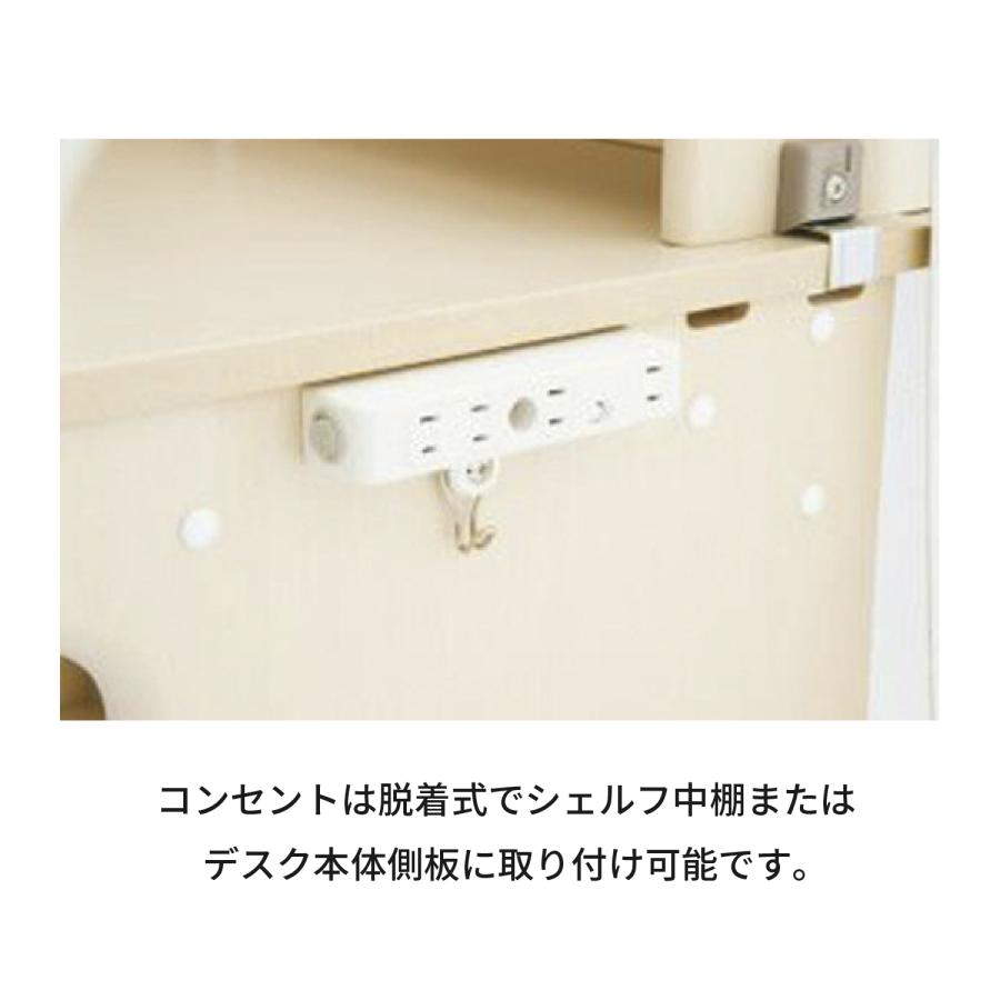 デスク本体は拡張天板をつけることで奥行が8cm拡張可能。専用金具付。コンセントは脱着式でデスク本体側板にも取付可能(3口+ライト専用1口)