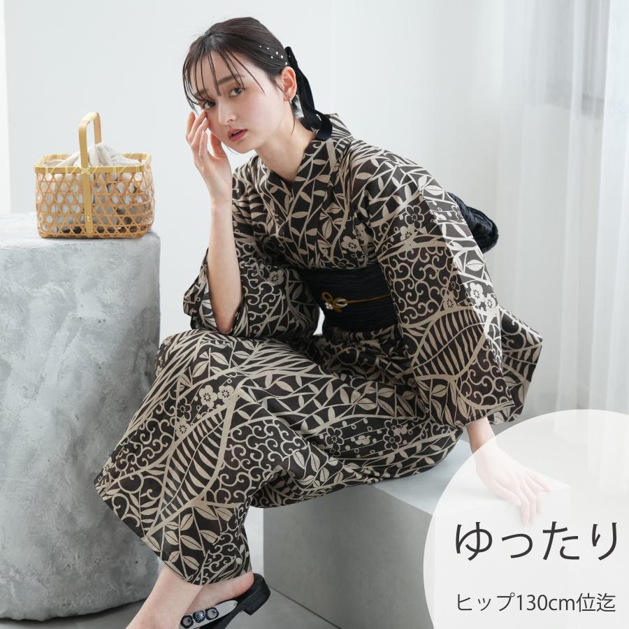 浴衣 レディース セット ニコアンティーク 高級変わり織 浴衣3点セット 焦げ茶によろけ草 ゆったり 3L 浴衣セット(ゆかた・帯・下駄)レトロ 大きい