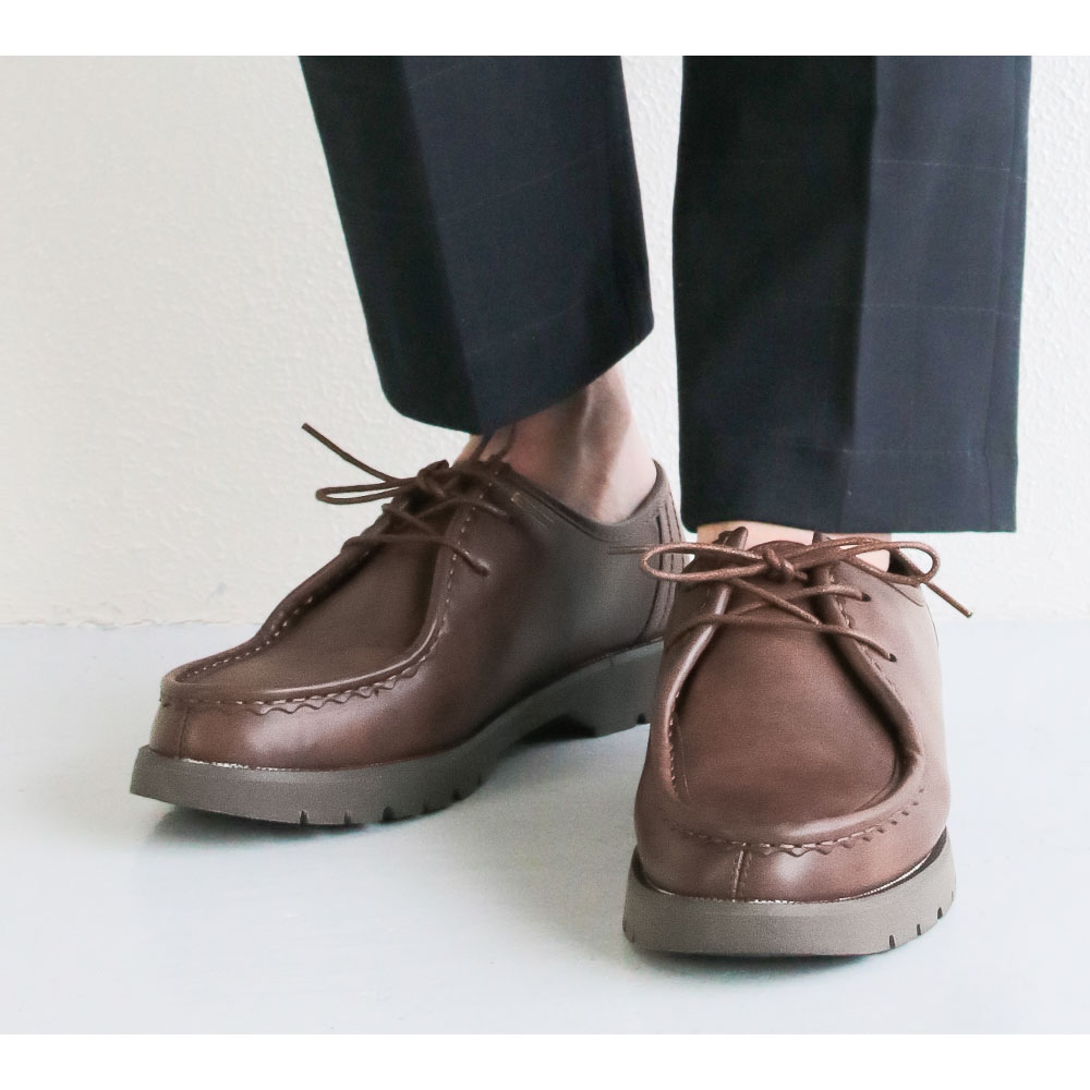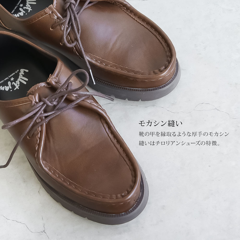 靴の甲を縁取るような厚手のモカシン縫いは、チロリアンシューズの特徴。