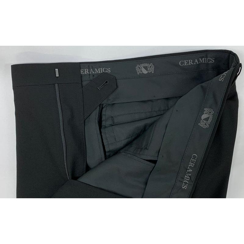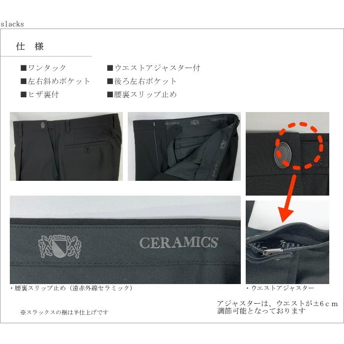 スラックスはアジャスター付きで、ウエスト±6cm調節可能。ウエスト内側には遠赤外線セラミックプリントの滑り止め加工を施しました。