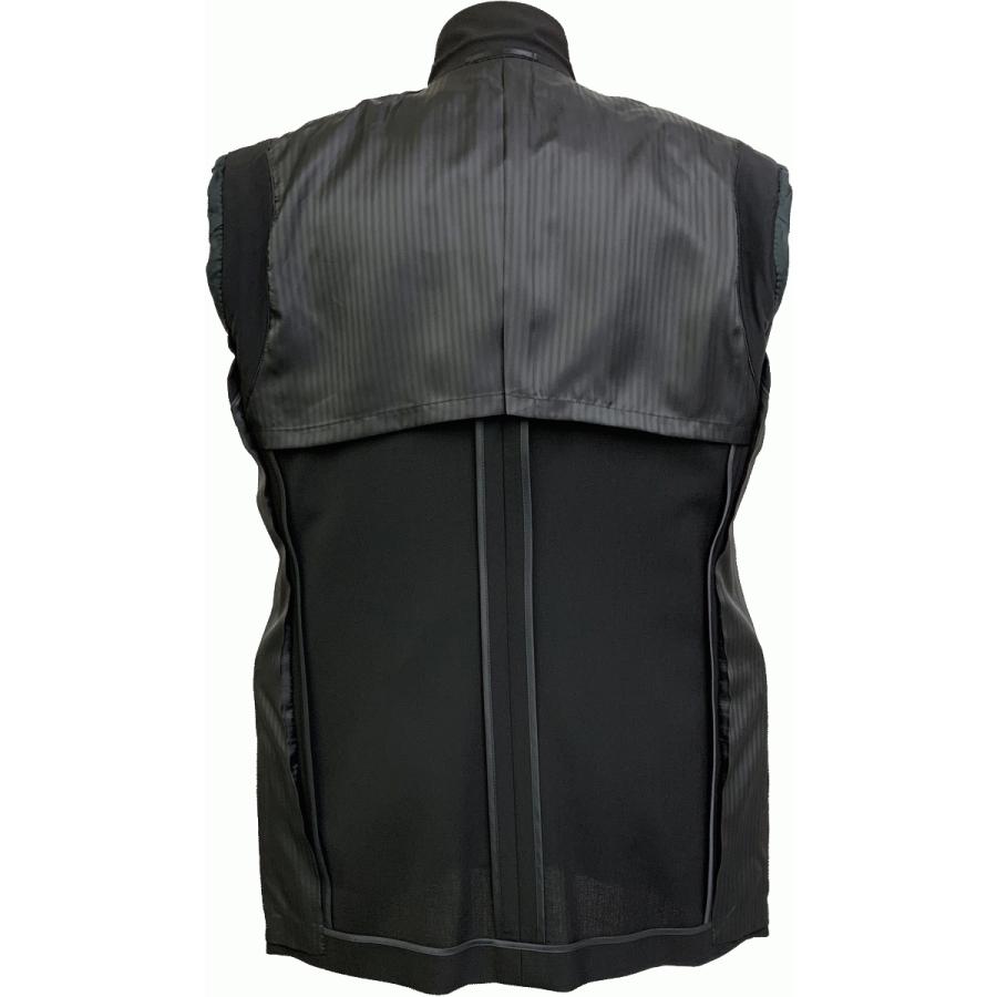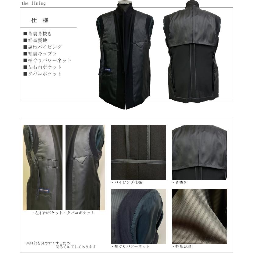 ■特徴:表地には、経糸、緯糸とも精紡交撚糸を使用。軽量で通気性に優れています。精紡交撚糸独特のシャリ感、清涼感。オフスケール濃染加工により深みのある黒。袖ぐりにパワーネットを使用し、着心地快適。