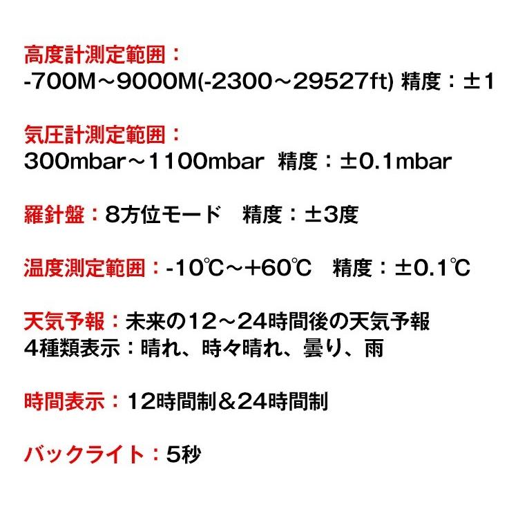 ■高度計/気圧計/羅針盤/温度計/天気予報 /時間表示/バックライト/カレンダー