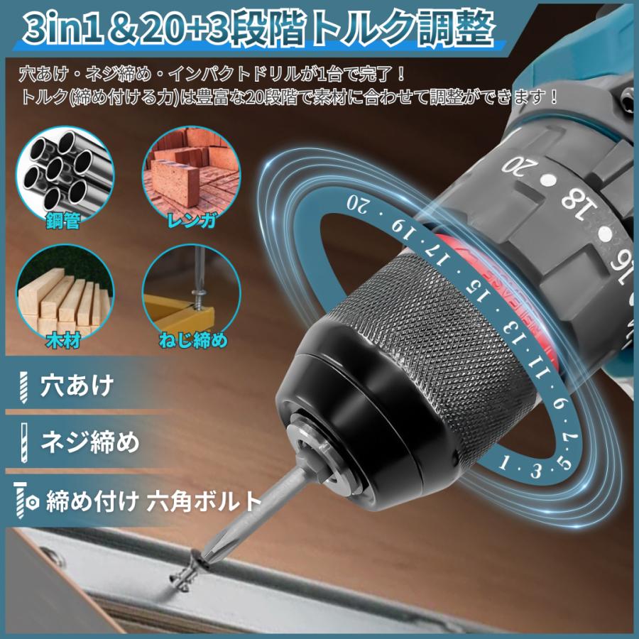 【高性能トルク設定&モード切替】 20段クラッチで豊富なトルク設定が可能です。 さらにドリル、ドライバー、振動ドリルの3つのモードを簡単に切り替えることができます。