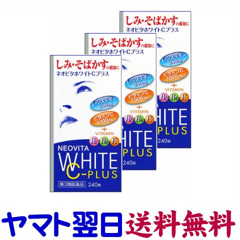 ★★南東北〜九州まで全国あすつく★★【第3類医薬品】市販薬 ネオビタホワイトCプラス(3個セット)は、しみ、そばかす、日焼けやかぶれ等による皮膚の色素沈着に効く医薬品。しみ、そばかす原因のメラニン色素生成を抑制するビタミンCを1日量で1000mg配合、皮膚新陳代謝を活発にしてビタミンCの働きを助けるL-システインも240mg配合しています。さらに肌の血行を良くし色素沈着の緩和をする天然型ビタミンE、ビタミンB2、B6も配合しています。1日2回の服用でのみやすいフィルムコーティング錠。成人(15歳以上)は、1回量3錠を1日2回、朝夕食後に水またはお湯でかまずに服用してください。7歳未満は服用しないでください。<皇漢堂製薬>【240錠入×3個セット(120日分)】