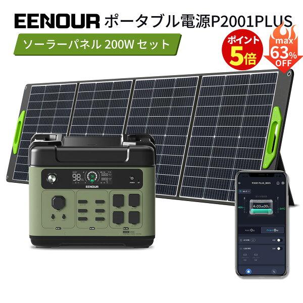 | 付属品 | 2点セット P2001PLUS+200W*1枚 1 xEENOUR ポータブル電源 P2001PLUS 1 xAC電源コード 1 xソーラー充電用ケーブル(MC4 to XT60) 1 xカーチャージケーブル(シガーソケット to XT60) 1 x 取扱説明書 1 xソーラーパネル200W(一式)