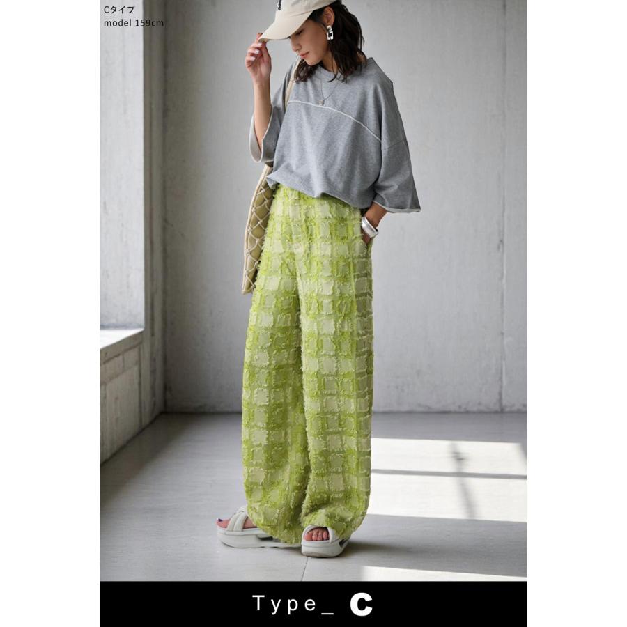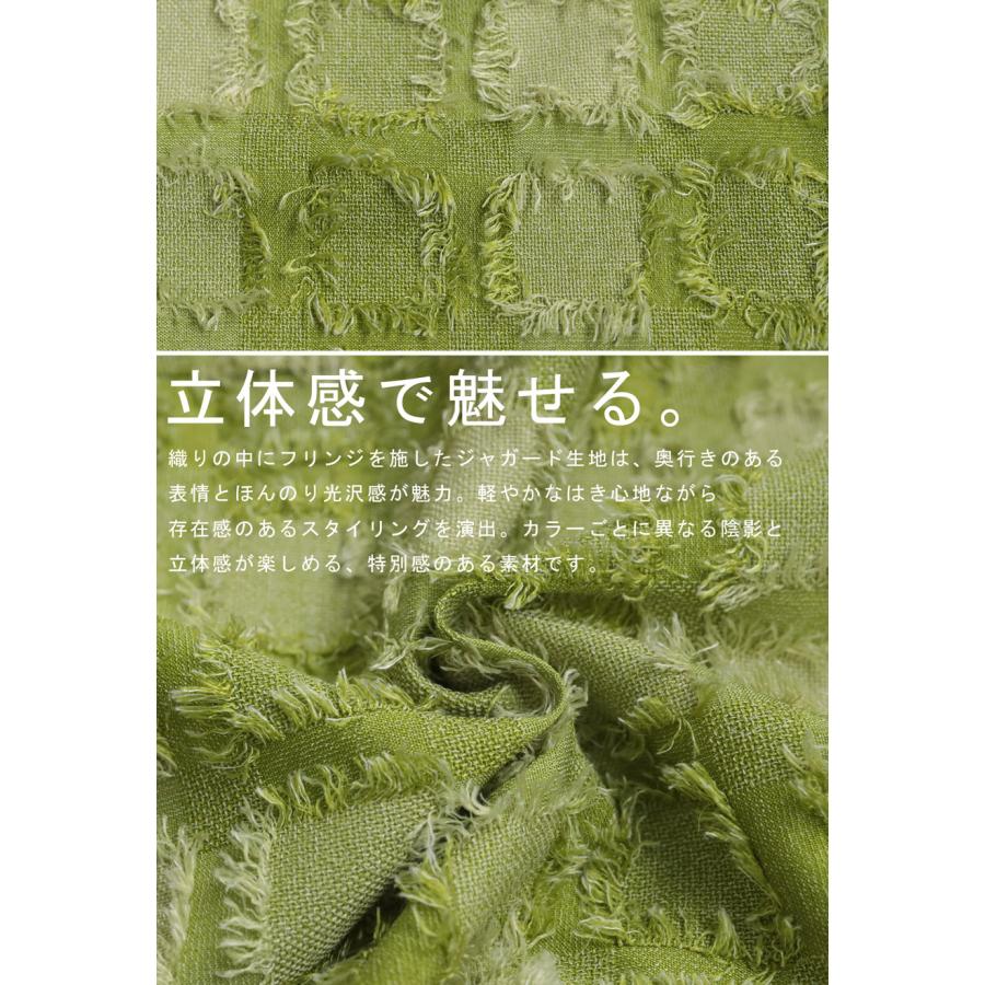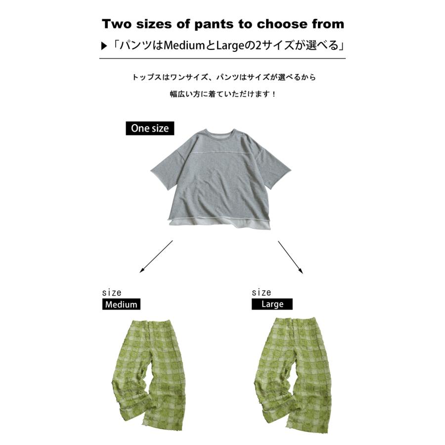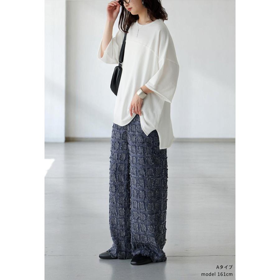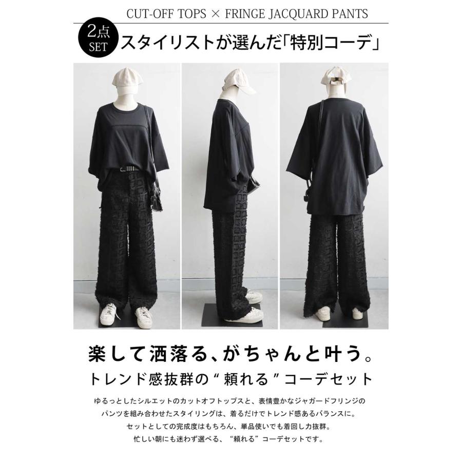 ×メール便不可!※詳細をPCサイトよりご購入前にご確認下さいませ。カットオフ仕様のコットントップスと、立体感あるフリンジジャガードパンツの2点セットアップ。トップスは綿100%でさらりと軽やかな肌ざわり。ヒップまで隠れるゆったりシルエットが体型カバーにも効果的です。パンツはブロック状の織り柄にフリンジを加えた特別感のある素材で、軽くて動きやすい着用感。ウエストは後ろゴム仕様、両サイドポケット付き。セットでも単品でも着回し力抜群。3色展開で、選ぶ色によって雰囲気の変化も楽しめます。
