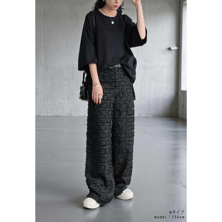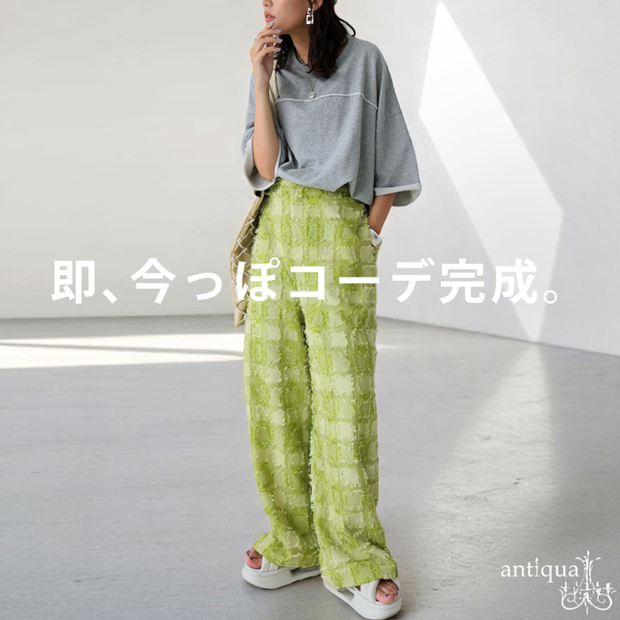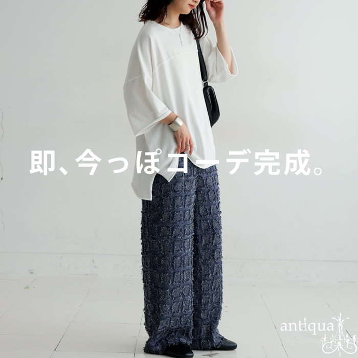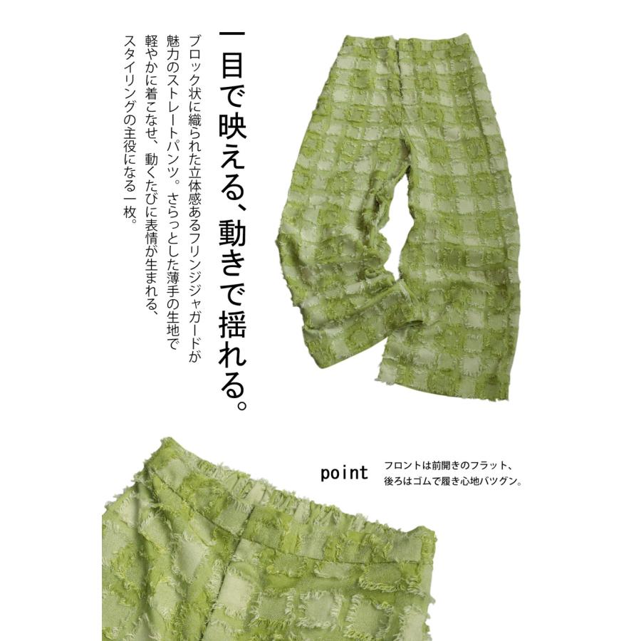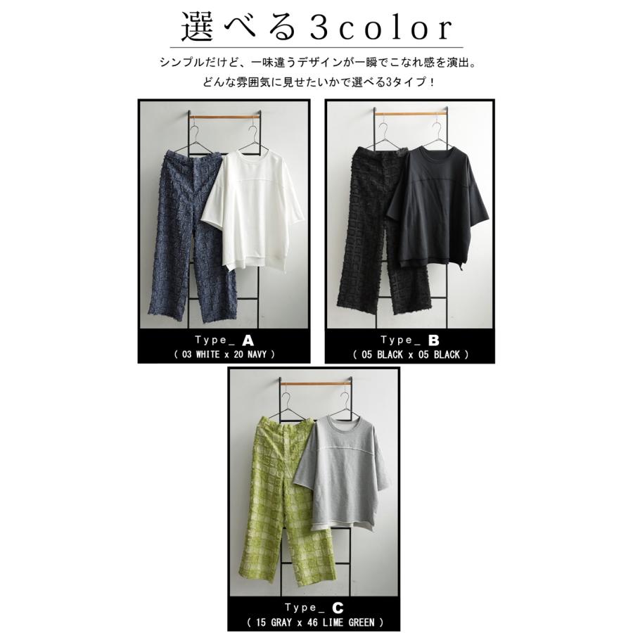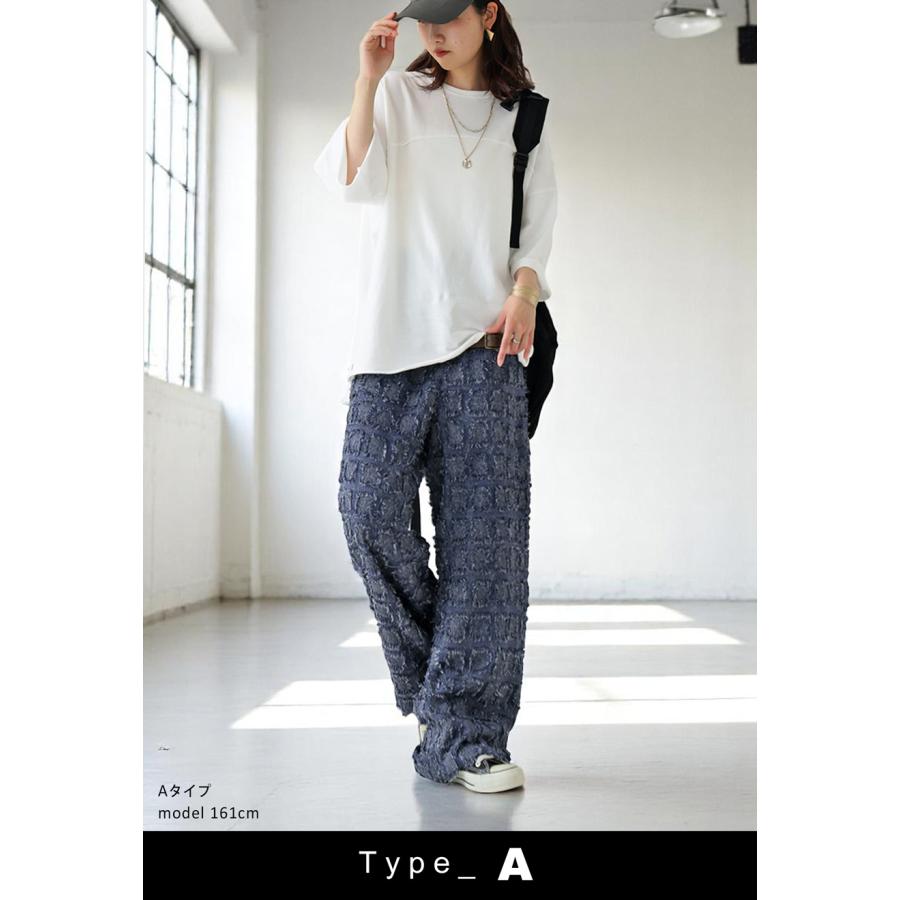 ×メール便不可!※詳細をPCサイトよりご購入前にご確認下さいませ。カットオフ仕様のコットントップスと、立体感あるフリンジジャガードパンツの2点セットアップ。トップスは綿100%でさらりと軽やかな肌ざわり。ヒップまで隠れるゆったりシルエットが体型カバーにも効果的です。パンツはブロック状の織り柄にフリンジを加えた特別感のある素材で、軽くて動きやすい着用感。ウエストは後ろゴム仕様、両サイドポケット付き。セットでも単品でも着回し力抜群。3色展開で、選ぶ色によって雰囲気の変化も楽しめます。