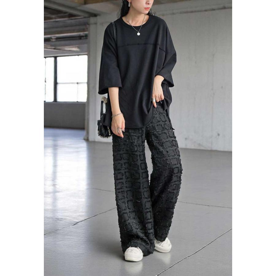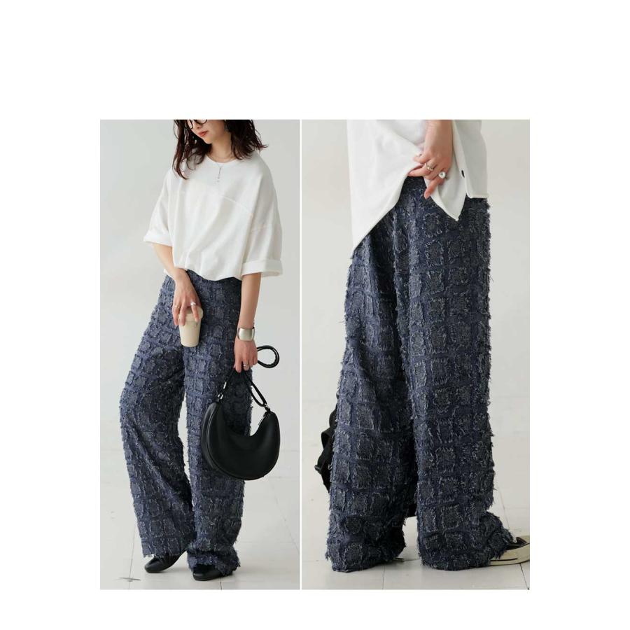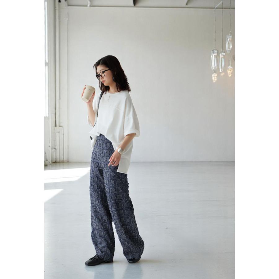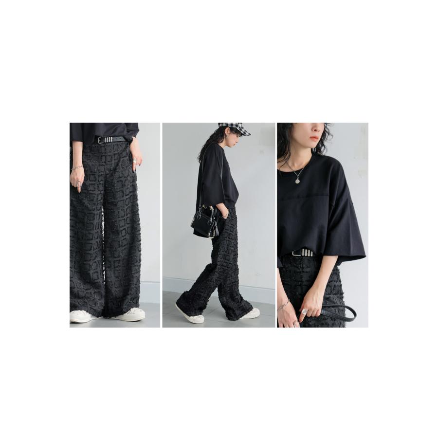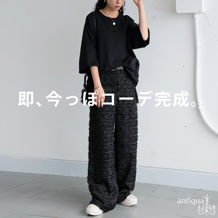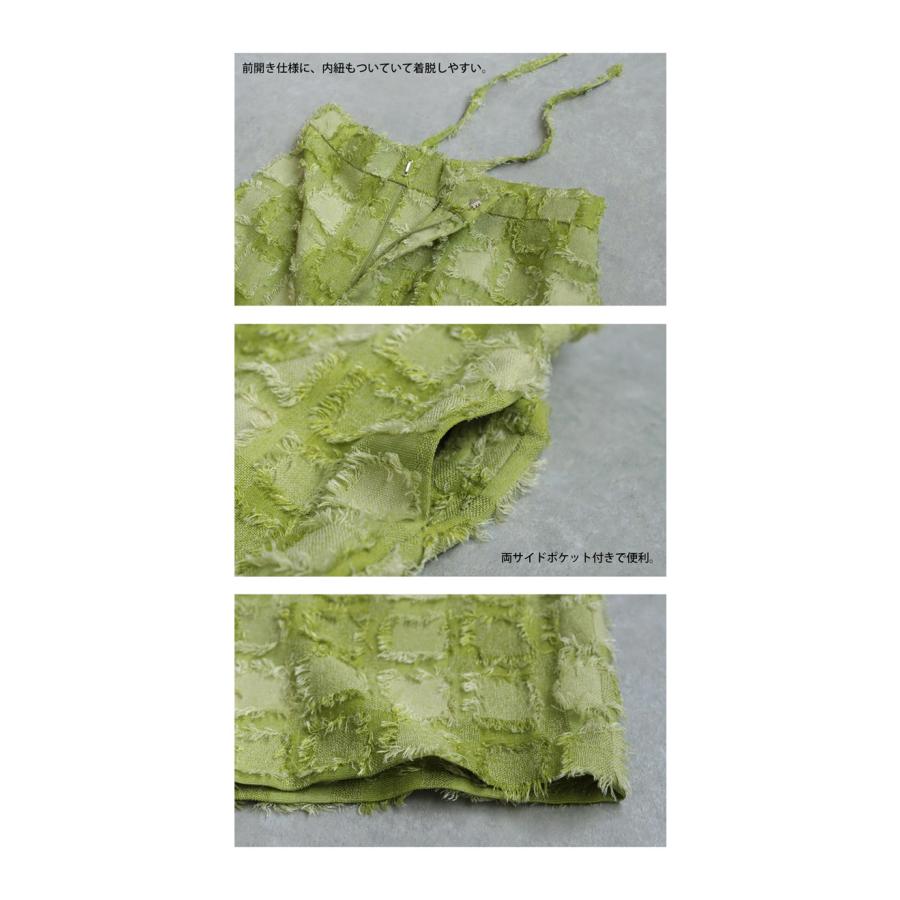 ×メール便不可!※詳細をPCサイトよりご購入前にご確認下さいませ。カットオフ仕様のコットントップスと、立体感あるフリンジジャガードパンツの2点セットアップ。トップスは綿100%でさらりと軽やかな肌ざわり。ヒップまで隠れるゆったりシルエットが体型カバーにも効果的です。パンツはブロック状の織り柄にフリンジを加えた特別感のある素材で、軽くて動きやすい着用感。ウエストは後ろゴム仕様、両サイドポケット付き。セットでも単品でも着回し力抜群。3色展開で、選ぶ色によって雰囲気の変化も楽しめます。