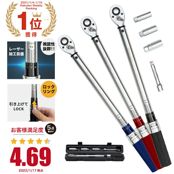 🚙【高品質な台湾製】12.7mm (1/2インチ) トルクレンチ自動車用 ラチェット式 トルク対応値:40N・m(4.1kgf・m)〜200N・m(20.4kgf・m) 付属品:17mm薄口ロングソケット、19mm薄口ロングソケット、21mm薄口ロングソケット、エクステンション(全長12.5cm)、ケース、取扱説明書