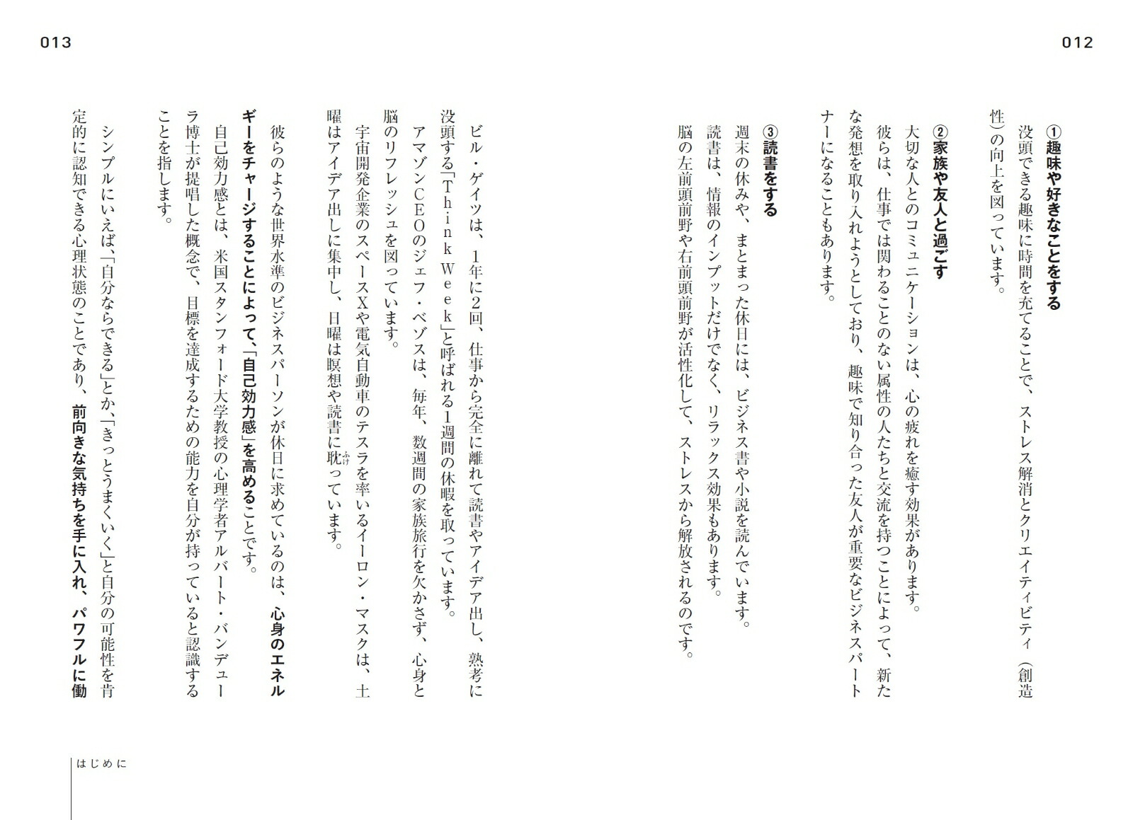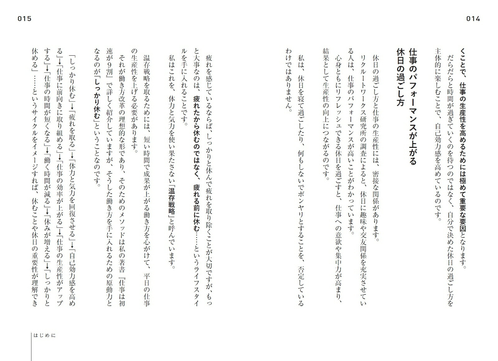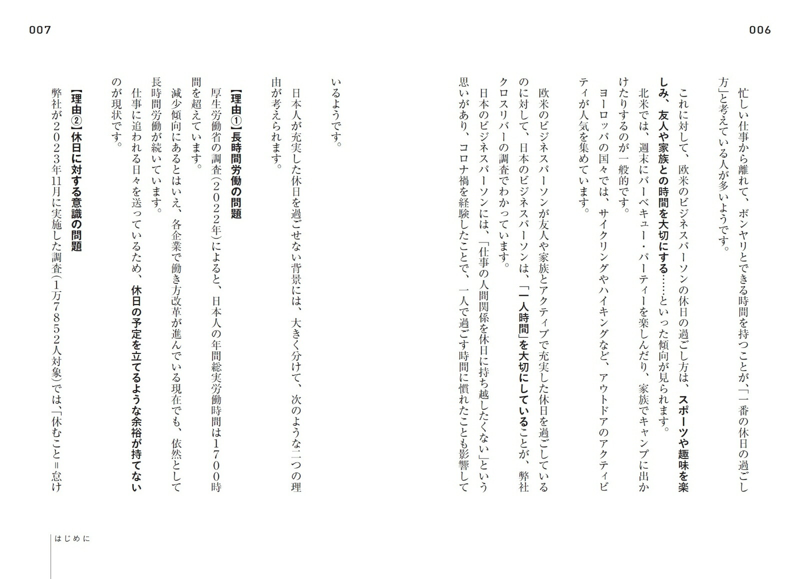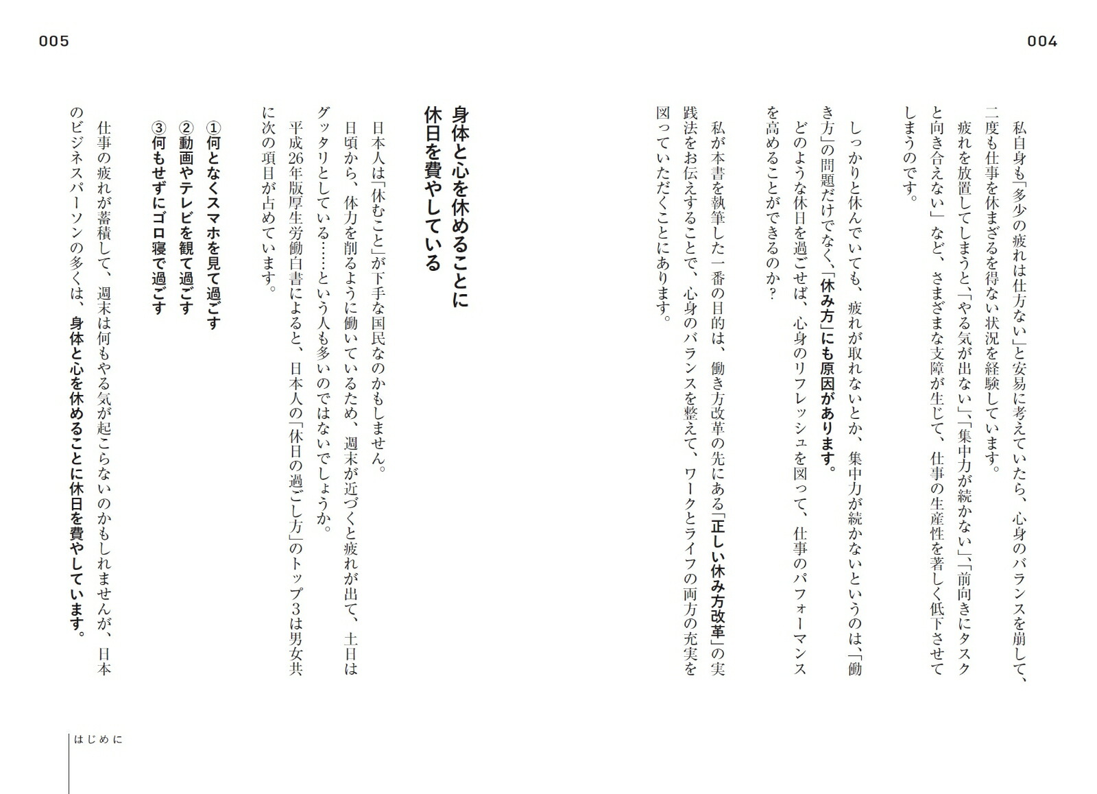 第1章 日本人は、なぜ疲れていても休めないのか?(日本人の休日が増えていない二つの要因/日本中の企業にコロナ禍の「後遺症」が蔓延している ほか)/第2章 ここが違う!「世界」の休日と「日本」の休日(世界の一流はどんな「休み方」をしているのか?/世界のエグゼクティブは「休む」ために仕事をしている ほか)/第3章 世界の一流は休日に「自己効力感」を高める(自己効力感とは、自信を持ってポジティブに仕事と向き合うマインド/「自己肯定感」ではなく「自己効力感」を重視する理由 ほか)/第4章 「土曜」と「日曜」を戦略的に使い分ける(世界の一流は、休日に「休養」と「教養」を手に入れている/休日を「チャレンジデー」と「リフレッシュデー」に分ける ほか)/第5章 休日に「1日7分」の新習慣(1日7分で「休養」と「教養」を手に入れるメソッド/自分のコンディションを認識して、行動パターンを使い分ける ほか)
