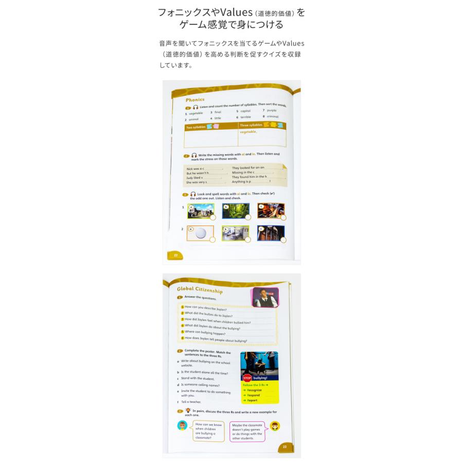 英語を学び始めた子供たちがよく触れる、使用頻度の高い単語で物語を楽しめるディズニー絵本に加えて、読んだ内容を深く理解できるワークブックをセットにしました。