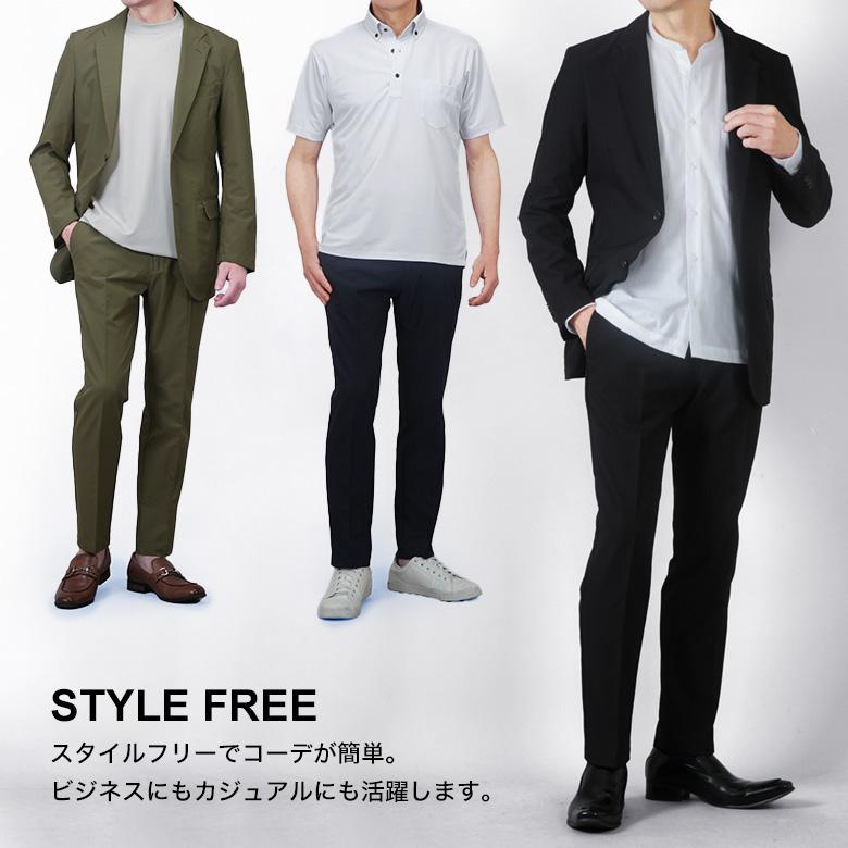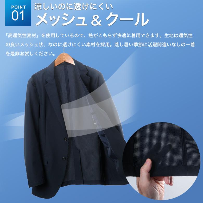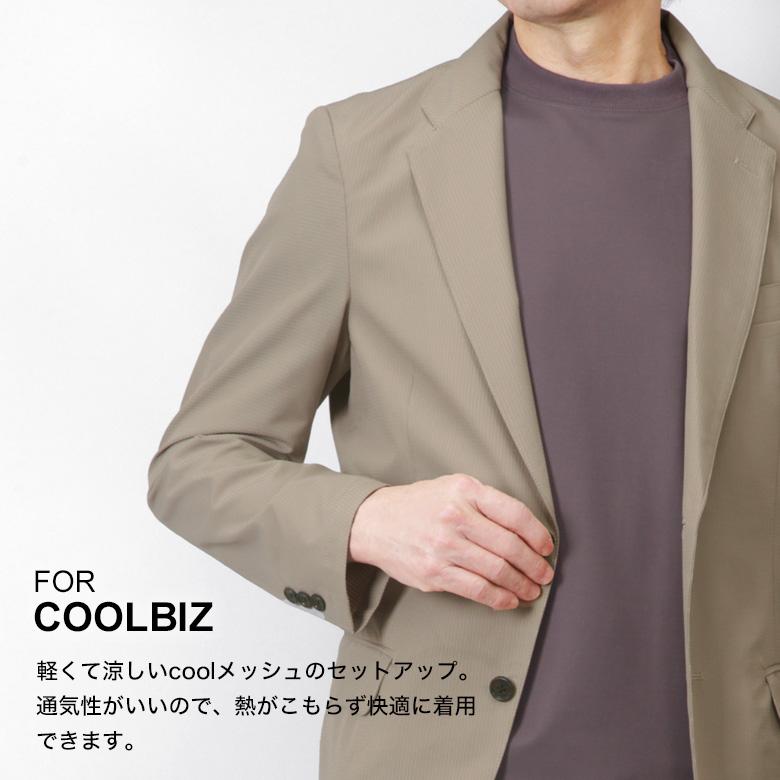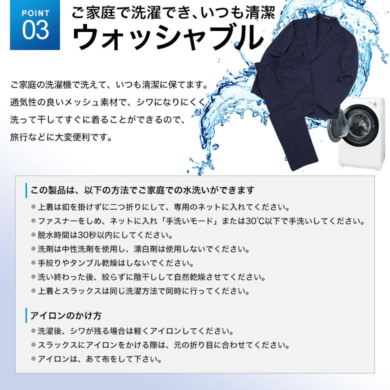 快適メッシュ&クール【清涼ストレッチスーツ】このセットアップスーツは、軽量で涼しい着心地を提供するメッシュ素材を使用しており、春夏秋の季節に最適です。ストレッチ生地により、動きやすさと快適さを兼ね備えています。防シワ加工が施されているため、ビジネスシーンでもカジュアルな場面でも、常にきちんとした印象を保てます。ご家庭の洗濯機で洗えて、お手入れも簡単です。パンツにはクリース加工が施されている為、洗っても折り目はくっきり。リモートワークや外出時にも活躍する、おしゃれで機能的な一着です。