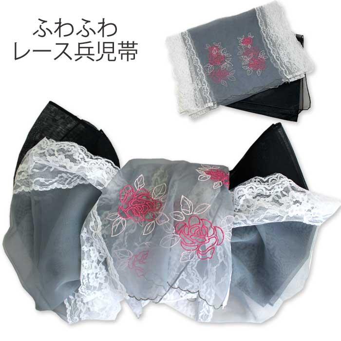 レースなし生地巾約32cm レースあり生地巾42センチ 総長約3.8m 生地 ナイロン100% レース ナイロン100% オーガンジー生地に刺繍とレースの2枚重ねです。3種類からお選びください。1.ブルー/ローズ 2.ブラック/ローズ 3.グレー/ローズ*兵児帯のみになります。着物は参考商品