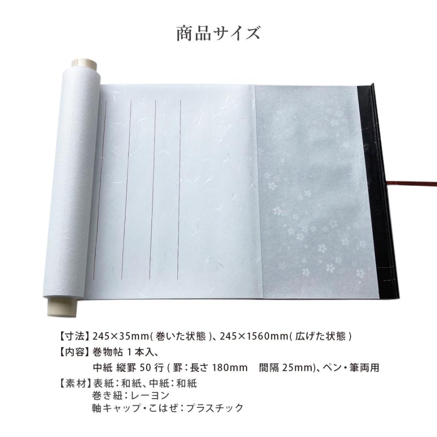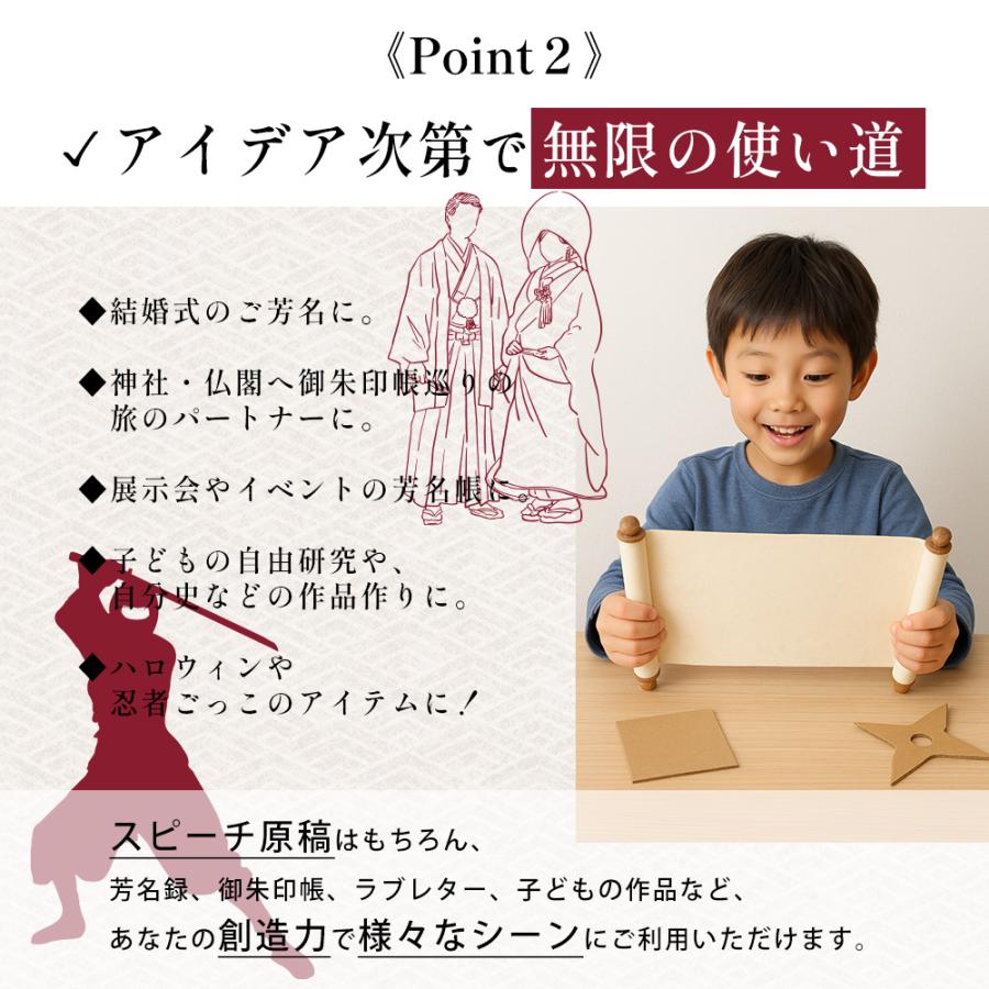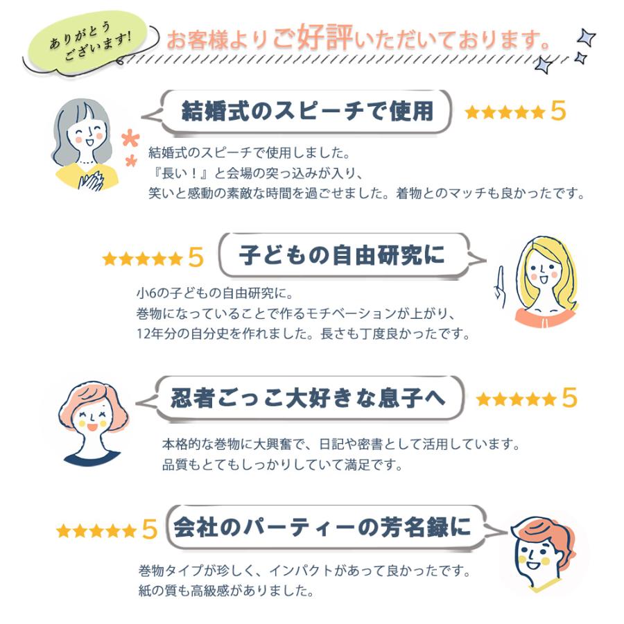 結婚式のスピーチや展覧会の芳名録に使える本格和紙巻物。上質な大礼紙でペンも筆も美しく書けます。広げると約1.5mありながら、巻けばコンパクトで収納便利。