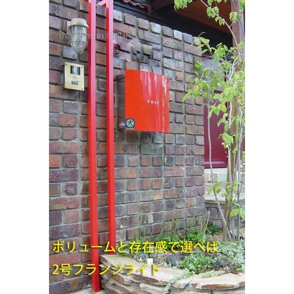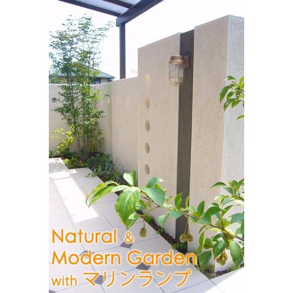 ○2号フランジライトはガードラインが2本入っているので、それにあわせてガラスグローブも長くなり1号に比べてかなりボリュウムアップします。両サイドの門柱など、ライトだけ設置する場合は、2号フランジライトの方がバランスよくておすすめです。真鍮は外気にさらしていると色が変わってきます。設置したばかりの頃、ギラギラした輝きは自然素材にあふれたガーデンには不似合いな感じがします。風化するように時を刻む真鍮素材。スローな感覚はナチュラル、カントリースタイルガーデンにぴったりです。