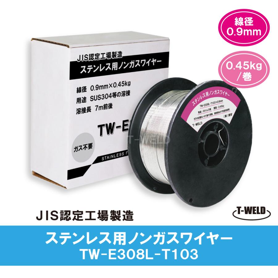 ノンガスワイヤー(ステンレス用) 0.9mm×0.45kg/巻■入数:2巻(0.45kg/巻×2)■スプール寸法:外径100mm、高さ48mm、取付内径16mm■特徴:溶接する時、ガス入りません!◆用途:ステンレス用 ◆溶接板厚:0.8〜4.0mm ◆溶接電流:30〜145A