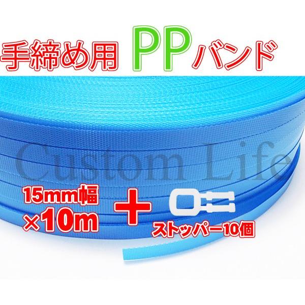 ■一般手締め用梱包バンド長さ10m+専用ストッパー10個セットの価格です。■幅(mm) 約15■厚さ(mm) 約0.5■引張強度(N) 約1000■用途 手締め、ストッパー用