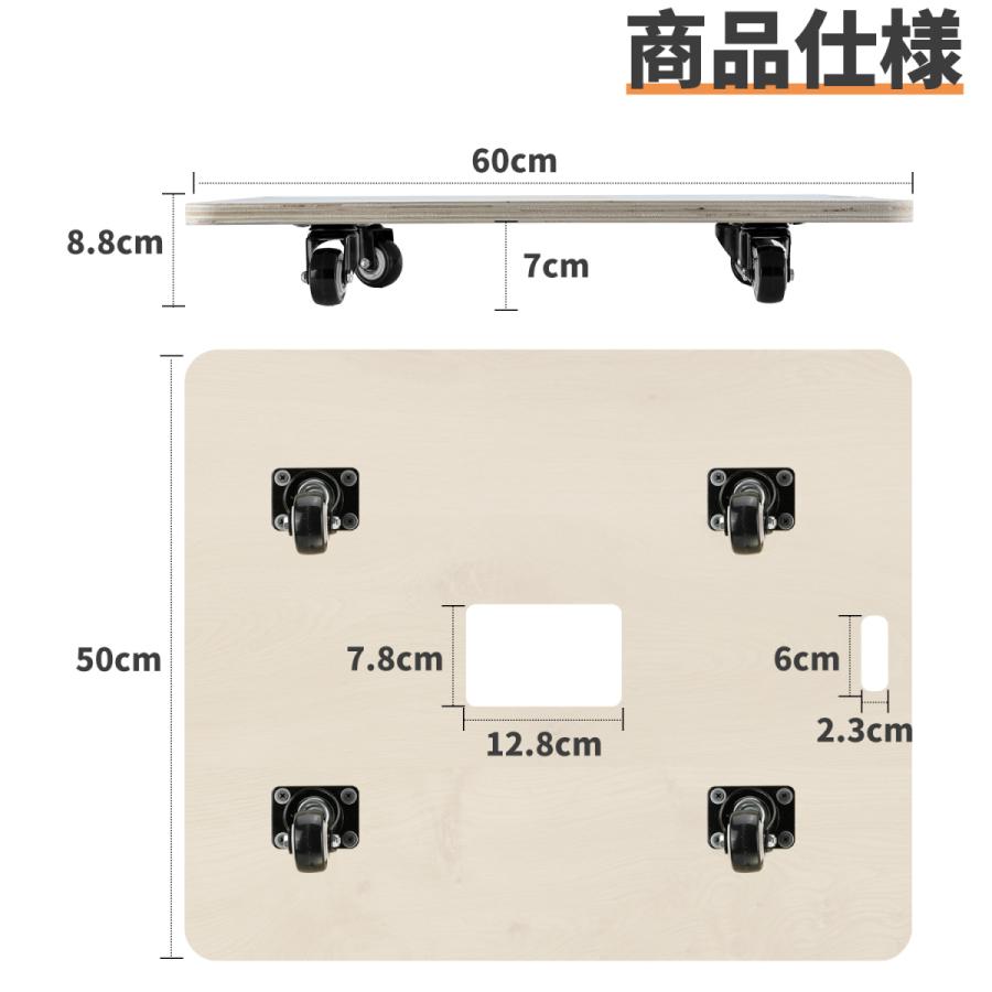 ●強固な合板をベースに作成し、引越し・機器の搬入等、大型重量物の搬送に最適な本物の木製平台車です。