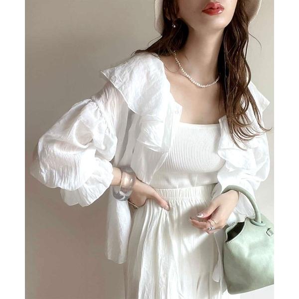 商品名:大人なシアー魅せ。ゆったり2wayラッフルフリルビッグカラーシアー素材ブラウス