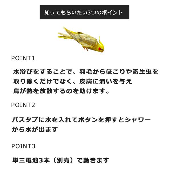・水遊びの好きな鳥に使用できます。・バスタブに水を入れてボタンを押すとシャワーから水が出ます。・水を飲んだり、顔を洗ったりする仕草を見ることができてかわいいデザインです。・乾電池3本が必要です。別途購入になります。・組み立ても簡単。プラスティック製なので、掃除も簡単です。横:約22cm縦:約18cm浴槽幅:約11cm