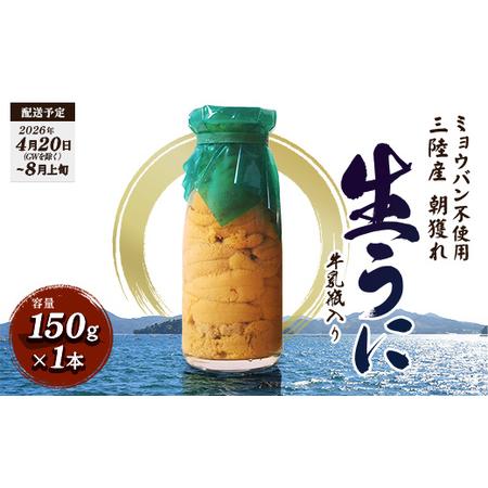 ■ 容量 牛乳瓶入り生うに(キタムラサキウニ) 150g×1本■ 配送について 2026年4月20日(GWを除く)〜2026年8月上旬にかけて、お申込み順に順次発送予定。 ■漁獲状況により発送時期が遅くなる場合がございます。 ■お申込み順が早い場合でも6月以降の発送、遅い場合は7月〜8月の発送になる場合もございますので、事前にご了承をお願いいたします。 ■4月下旬に発送が開始された場合でも、GW期間中の発送予定はございません。 タイプ:【冷蔵】