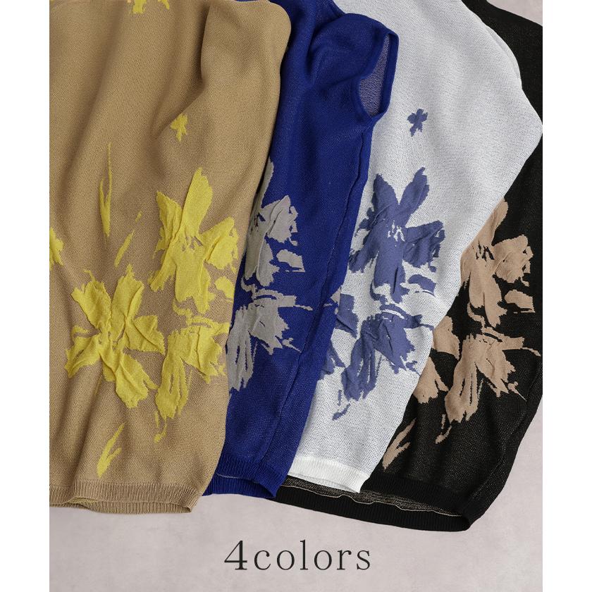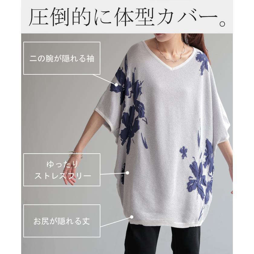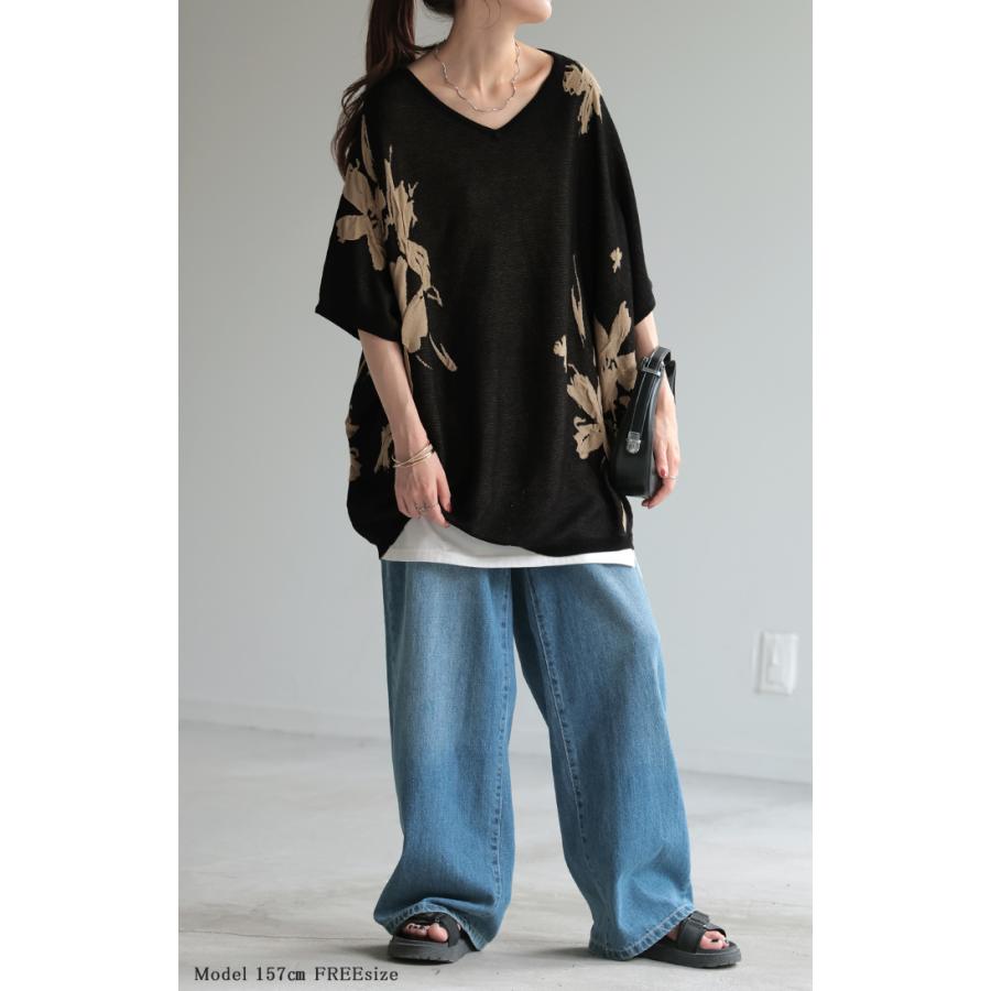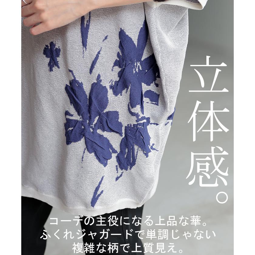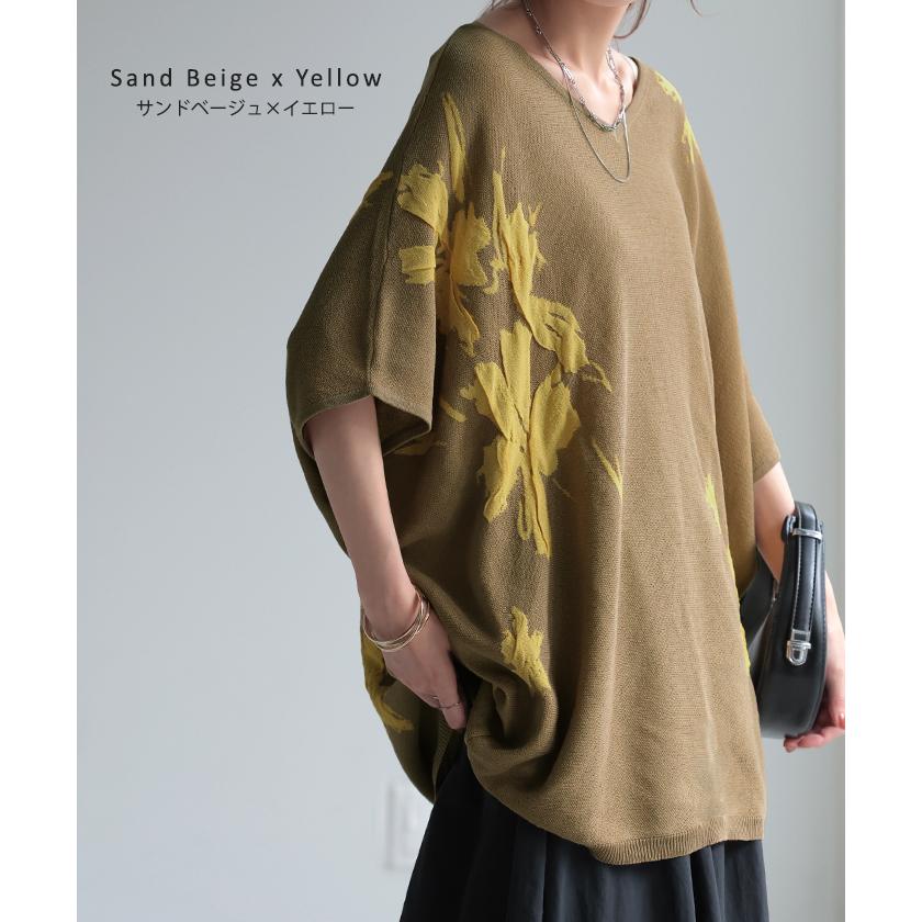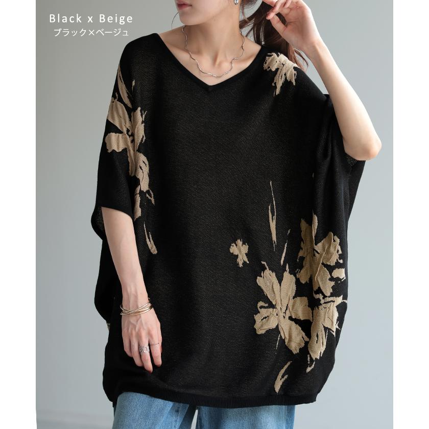 ジャガード スプリングニット 柄ニット 柄セーター フラワー 花 花柄 大柄 ジャガードニット 花柄ニット 半袖T 5分袖 五分袖 薄手 ミディアム ミドル 涼しい ビックT プルオーバー ロングニット ちくちくしない サラサラ 夏ニット 春ニット ブラック 黒 黒色 ホワイト 白 白色 ブルー 青 青色 イエロー 黄色 ベージュ ネイビー 紺 グレー 灰色 レディースファッション 旬 トレンド プラスサイズ オーバーサイズ 大きい 大きめ フリーサイズ フリー S M L LL 2L XL 3L XXL LLL カジュアル シンプル 大人 大人カジュアル オトナ 女性 綺麗 きれい キレイめ きれいめ 高見え 上質 上品 20代 30代 40代 50代 60代 おしゃれ お洒落 オシャレ 春 夏 秋 冬 春夏 秋冬 HUG.U HUGU ハグユー はぐゆー 半袖 ゆったり Vネック ライトニット 変形 ロング お尻が隠れる 大きいサイズ Tシャツ