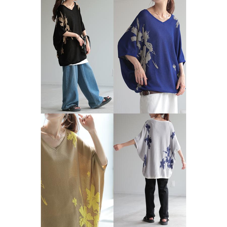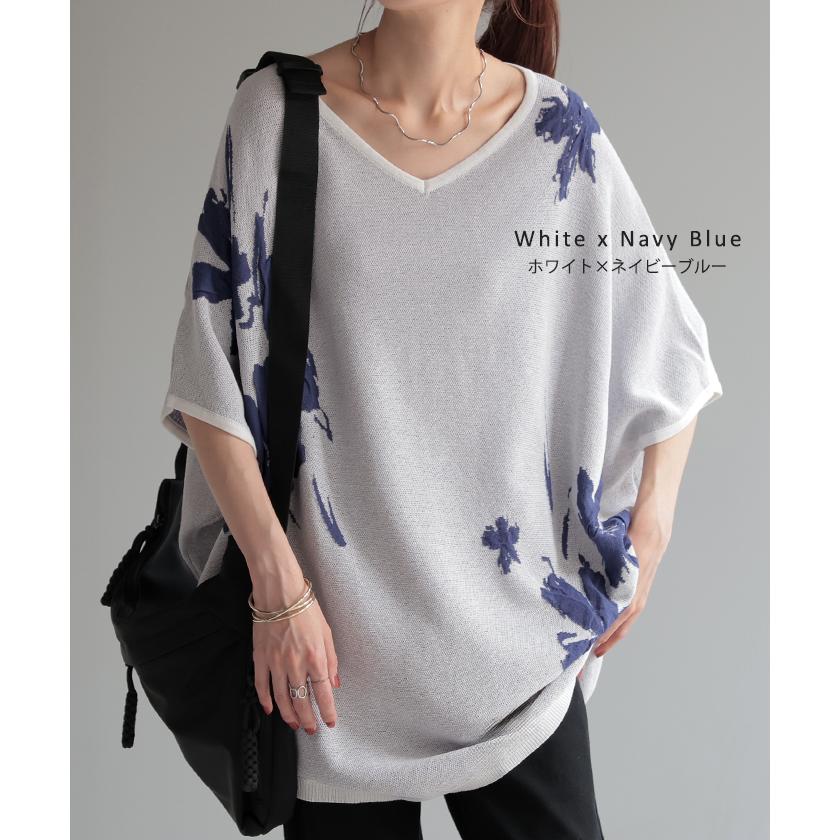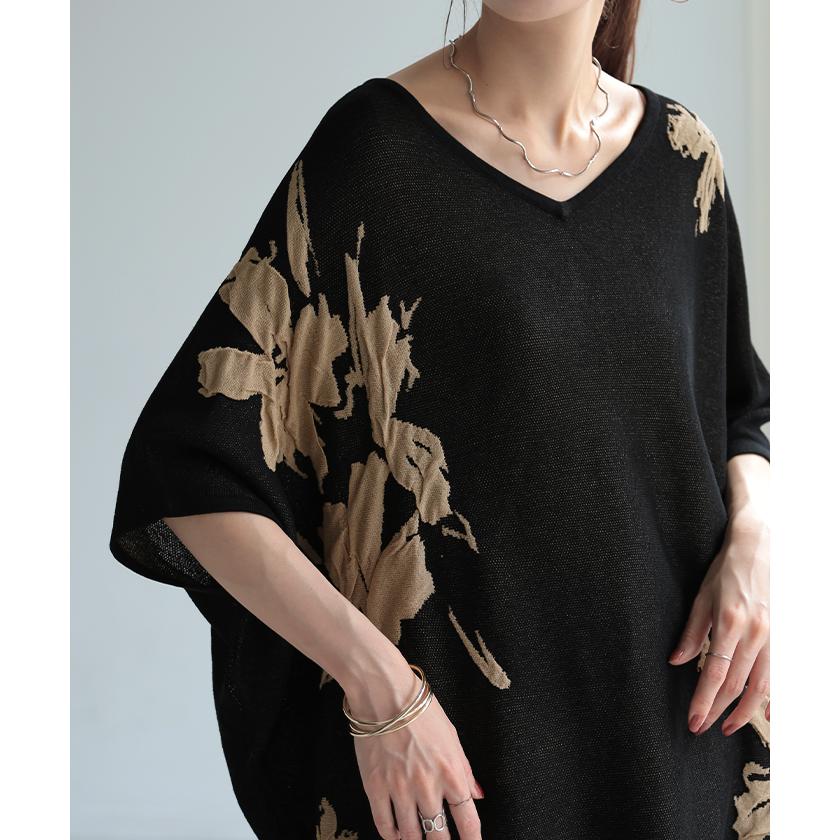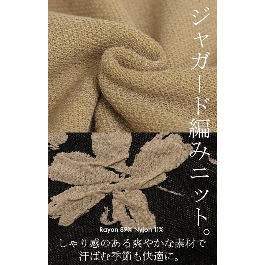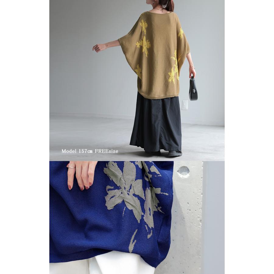 ジャガード スプリングニット 柄ニット 柄セーター フラワー 花 花柄 大柄 ジャガードニット 花柄ニット 半袖T 5分袖 五分袖 薄手 ミディアム ミドル 涼しい ビックT プルオーバー ロングニット ちくちくしない サラサラ 夏ニット 春ニット ブラック 黒 黒色 ホワイト 白 白色 ブルー 青 青色 イエロー 黄色 ベージュ ネイビー 紺 グレー 灰色 レディースファッション 旬 トレンド プラスサイズ オーバーサイズ 大きい 大きめ フリーサイズ フリー S M L LL 2L XL 3L XXL LLL カジュアル シンプル 大人 大人カジュアル オトナ 女性 綺麗 きれい キレイめ きれいめ 高見え 上質 上品 20代 30代 40代 50代 60代 おしゃれ お洒落 オシャレ 春 夏 秋 冬 春夏 秋冬 HUG.U HUGU ハグユー はぐゆー 半袖 ゆったり Vネック ライトニット 変形 ロング お尻が隠れる 大きいサイズ Tシャツ
