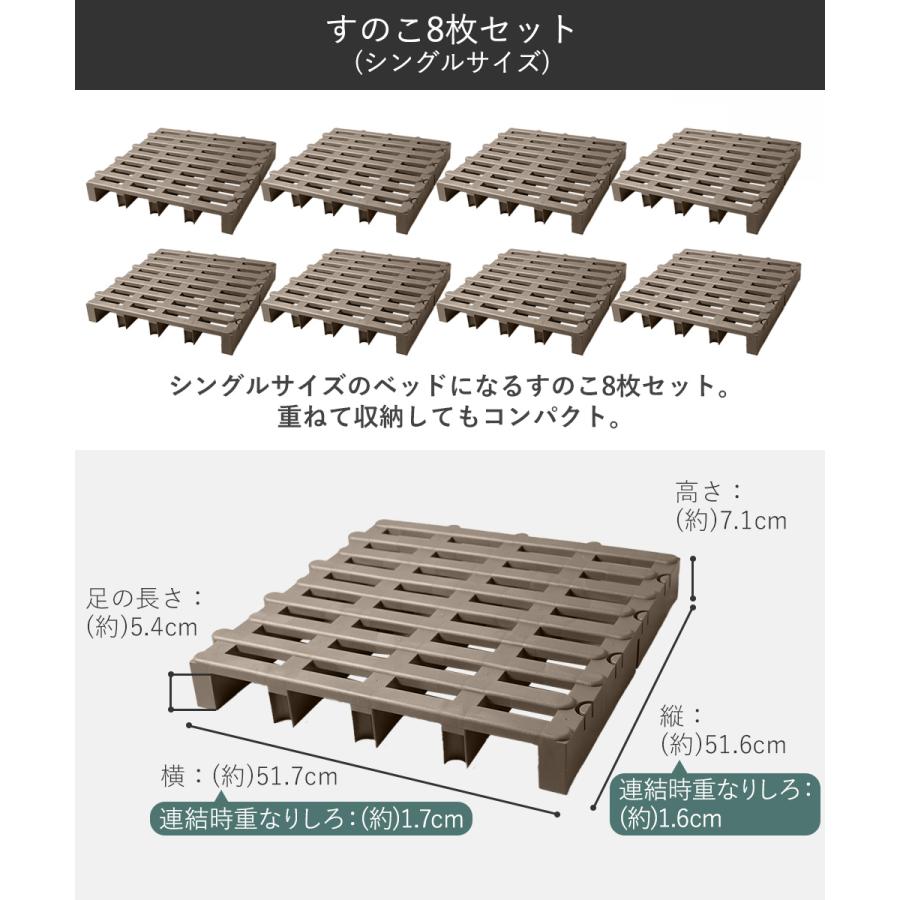 ■布団の下の湿気やカビ対策に!シングルサイズの布団にピッタリ!高床式ジョイント式すのこ8枚セット!■すのこ8枚でシングルの布団にちょうどいいサイズです。通気性に優れジメジメしにくいすのこは、花粉や梅雨のジメジメ、床からの冷えが気になる時期などに■通気性が悪く湿気が気になるクローゼットや納戸の下に敷いて湿気対策としても。■高床式なので、掃除機のノズルも奥まで入ります。■縦・横のどちらにでもジョイントできるのでズレにくい!■日本製の安心品質です。