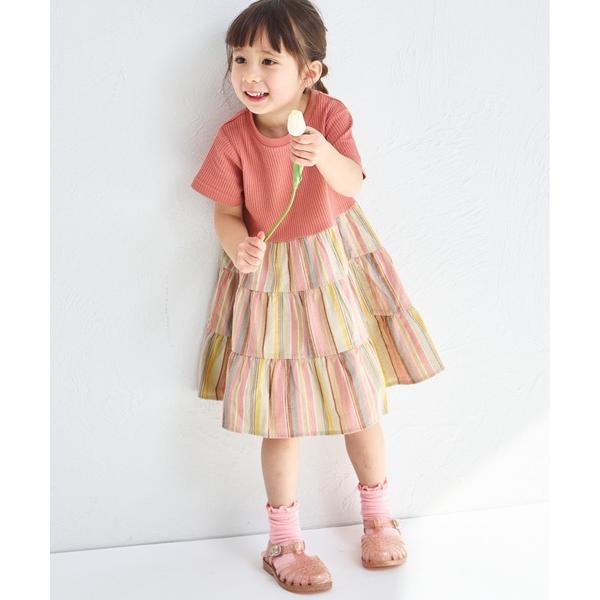 キーワード:ワンピース キッズ 子供服 女の子 ストライプ チェック ティアード ドット 半袖 膝丈