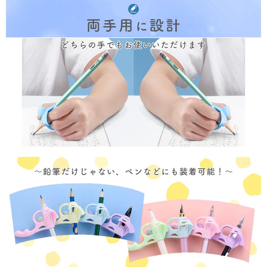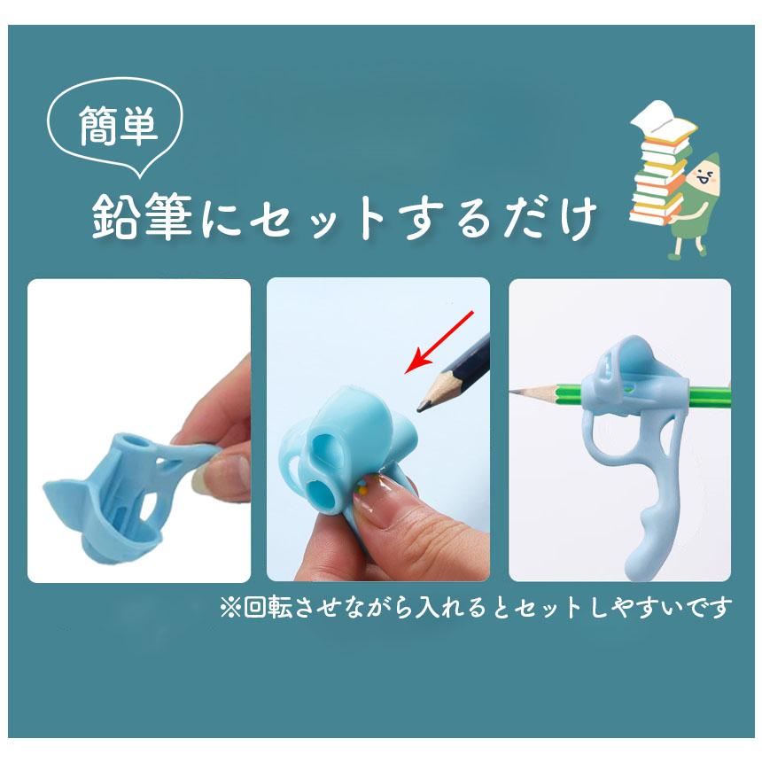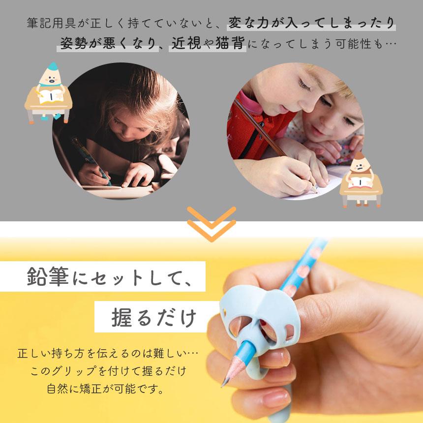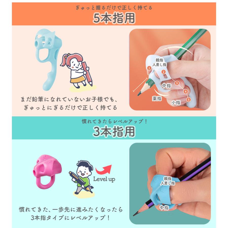 鉛筆持ち方矯正グリップペンの持ち方、姿勢が気になるお子さまや、社会人として字を美しく書きたい方、ペンを持つすべての方へ自信と正しい持ち方が得られるおすすめグリップ!鉛筆の正しい持ち方を伝えるのは、意外と難しい…でもこのグリップなら、つけて握るだけで自然に矯正できるんです!まだ持ち方に自信のない方用の5本指タイプ少し慣れてきたらレベルアップできる3本指用2種類をセットでお届けします。